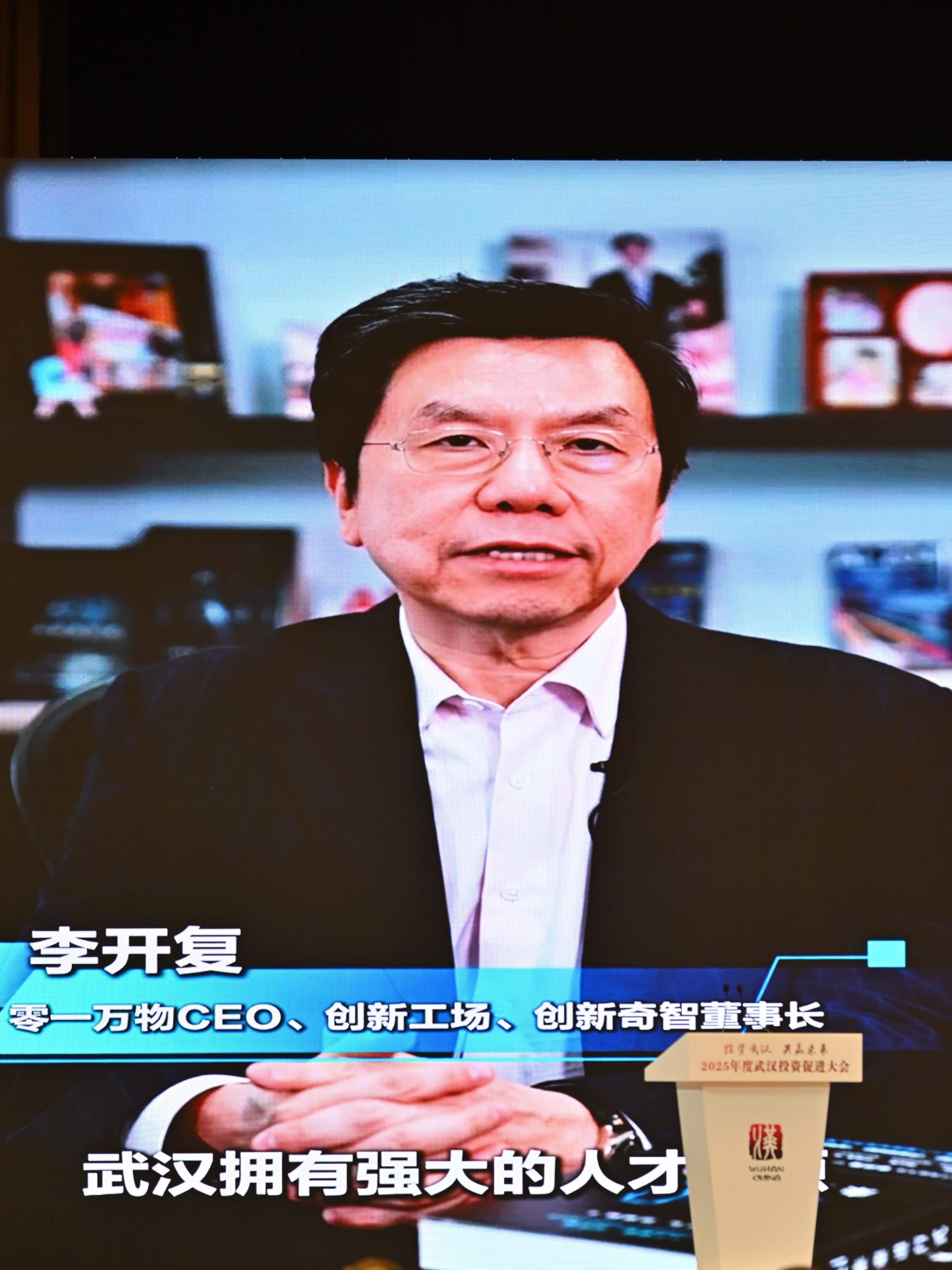 李开复、李斌通过视频向会场发言。 苗剑 摄