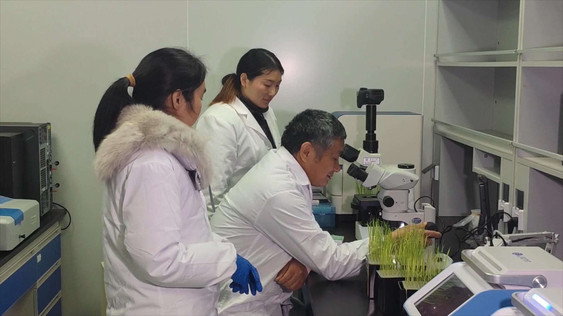 朱仁山和团队师生进行水稻育种实验。
