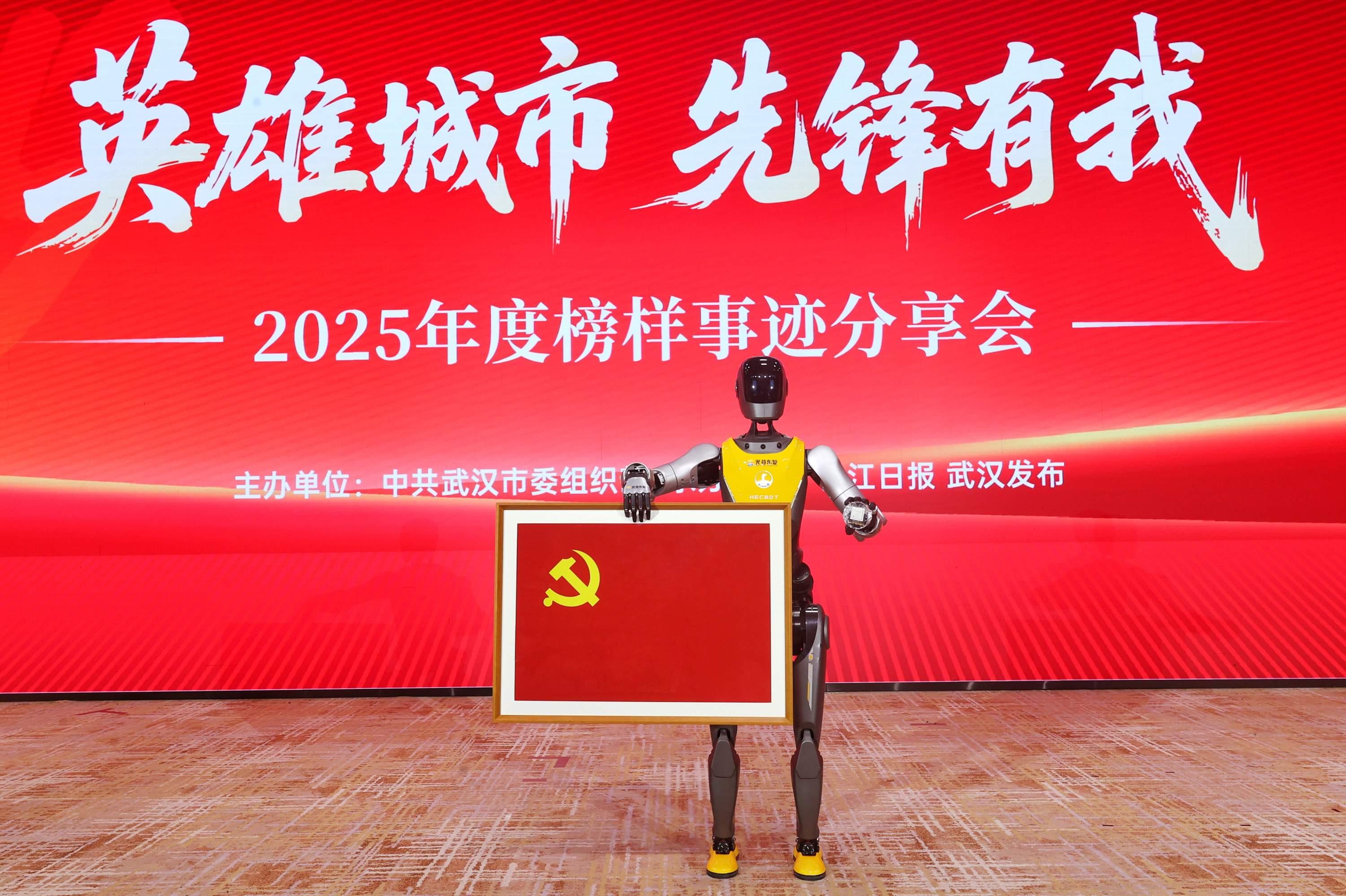 “英雄城市·先锋有我”2025年度榜样事迹分享会现场,智能机器人“光子”一手托举由玄武岩“编织”的党旗,一手紧握新能源汽车“星辰一号”芯片。