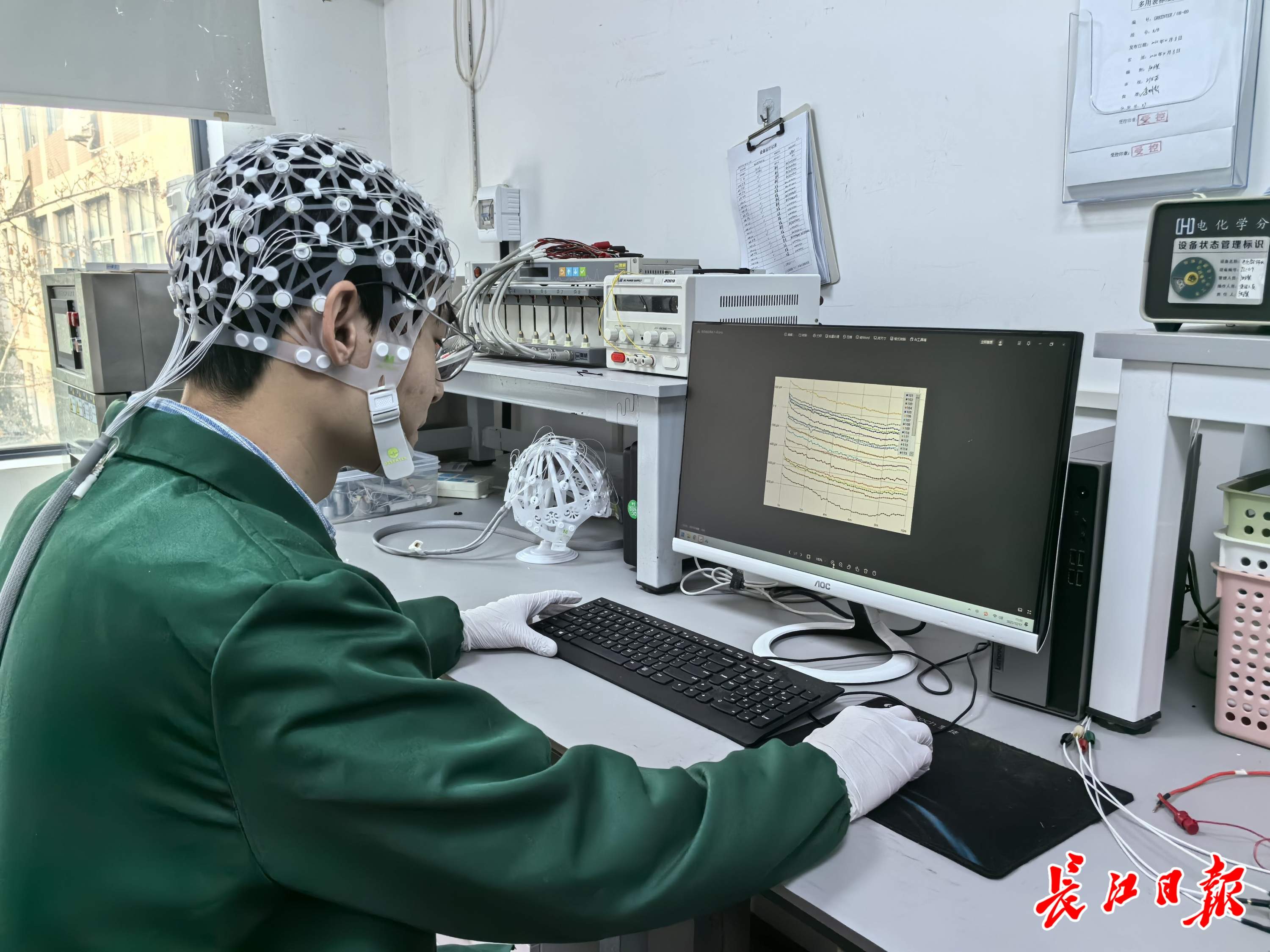 科研人员正在做脑电帽测试。记者覃柳玮 摄
