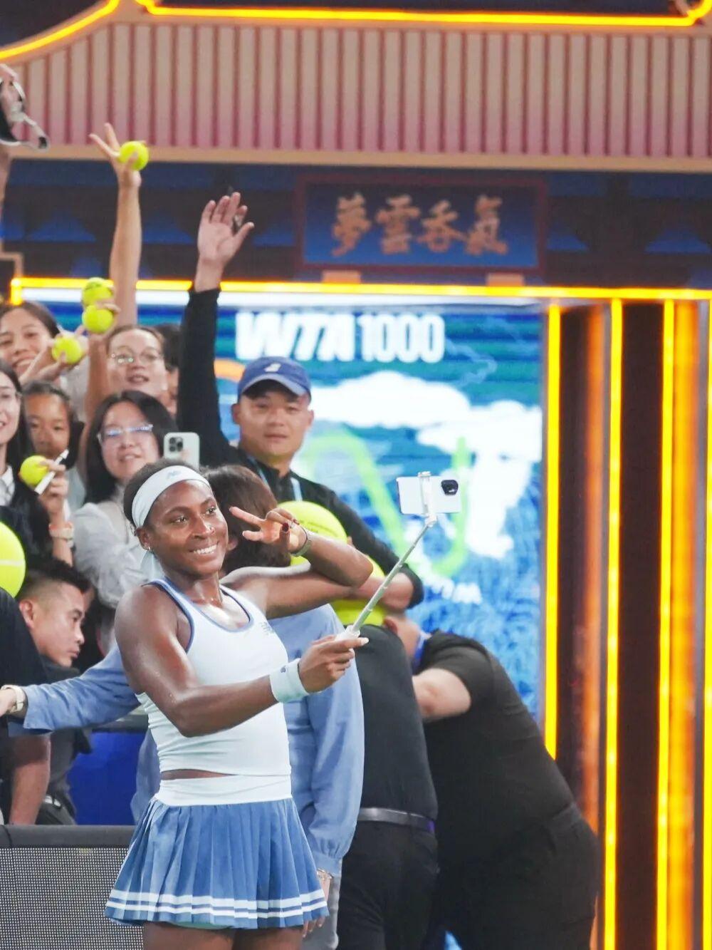 2025武汉网球公开赛冠军高芙与球迷合影。记者何晓刚 摄