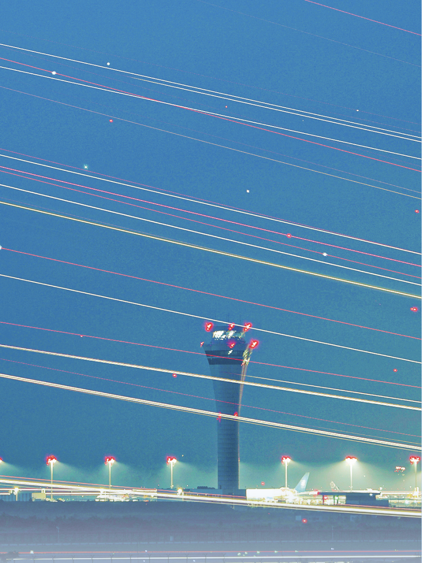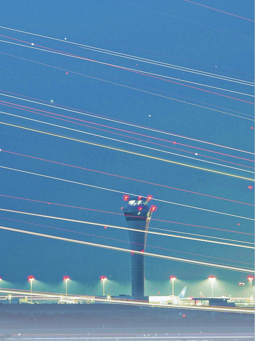 凌晨的花湖机场,众多货机依次起飞,在夜空中留下绚丽轨迹。记者史伟 摄
