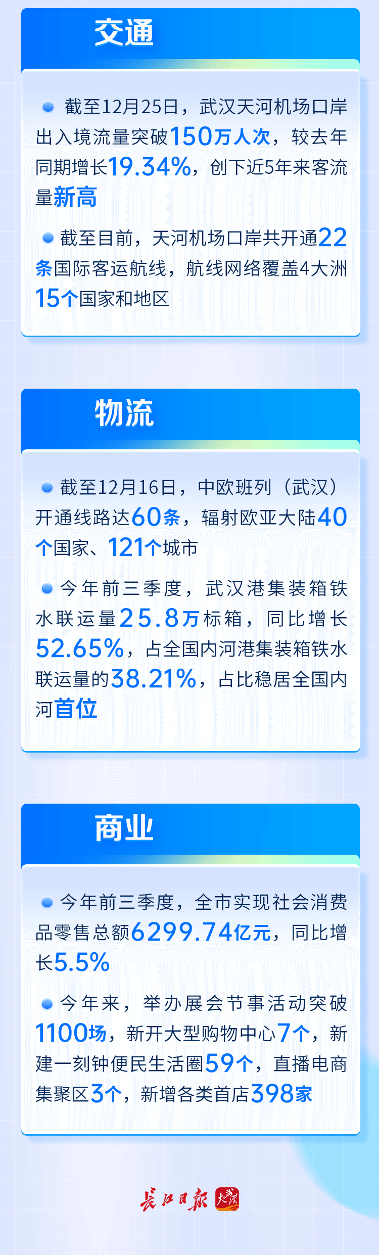 2025年,武汉成为全国第二个集齐“五型”国家物流枢纽的城市,交通网络持续升级,天河机场迈入三跑道时代,中欧班列(武汉)辐射40国121城。消费市场活力迸发,前三季度社零额增幅居副省级及以上城市第一。