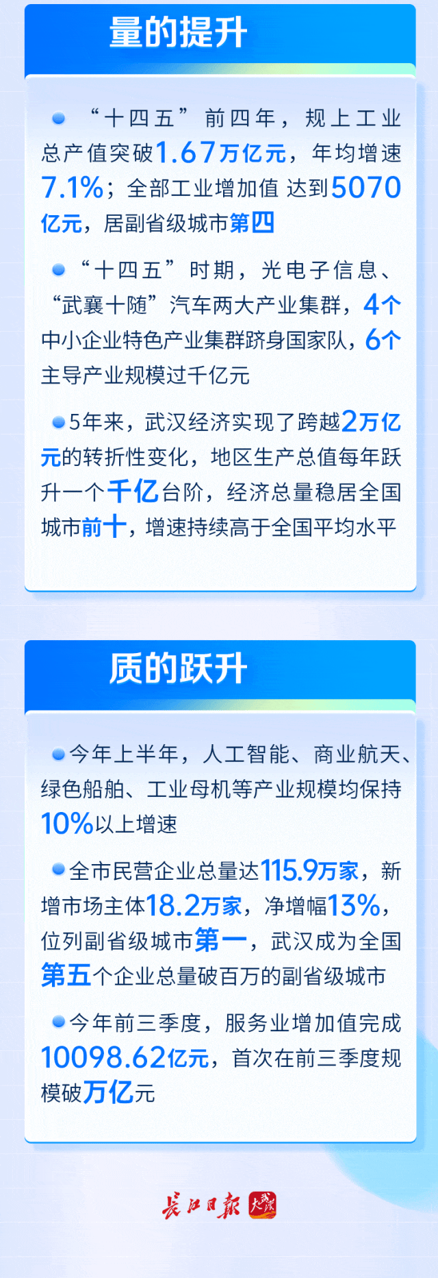 武汉锚定“五个中心”建设,坚持以经济建设为中心,GDP每年跃升一个千亿台阶,工业增加值居副省级城市第四,光电子信息等优势产业领跑全球。