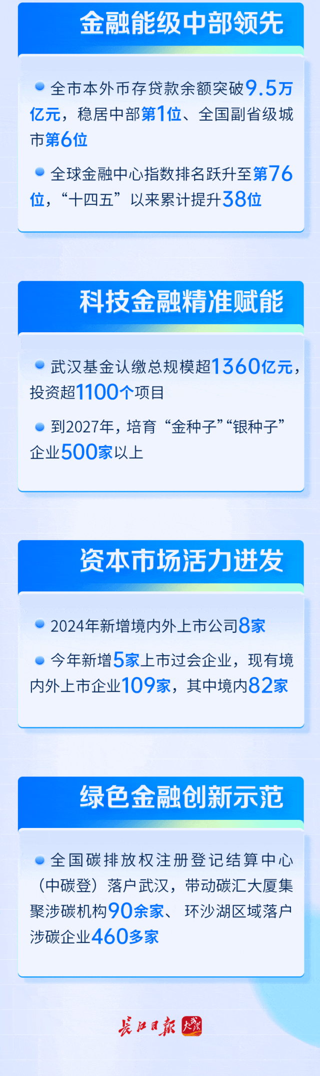 近年来,武汉将区域金融中心建设与一系列国家战略紧密衔接,取得积极成效:全市本外币存贷款余额突破9.5万亿元,稳居中部第1位、全国副省级城市第 6 位;集聚各类持牌金融机构 283 家,数量中部领先;在最新全球金融中心指数中排名跃升至第76位,“十四五”以来累计提升38位,城市金融竞争力获国内外广泛认可。