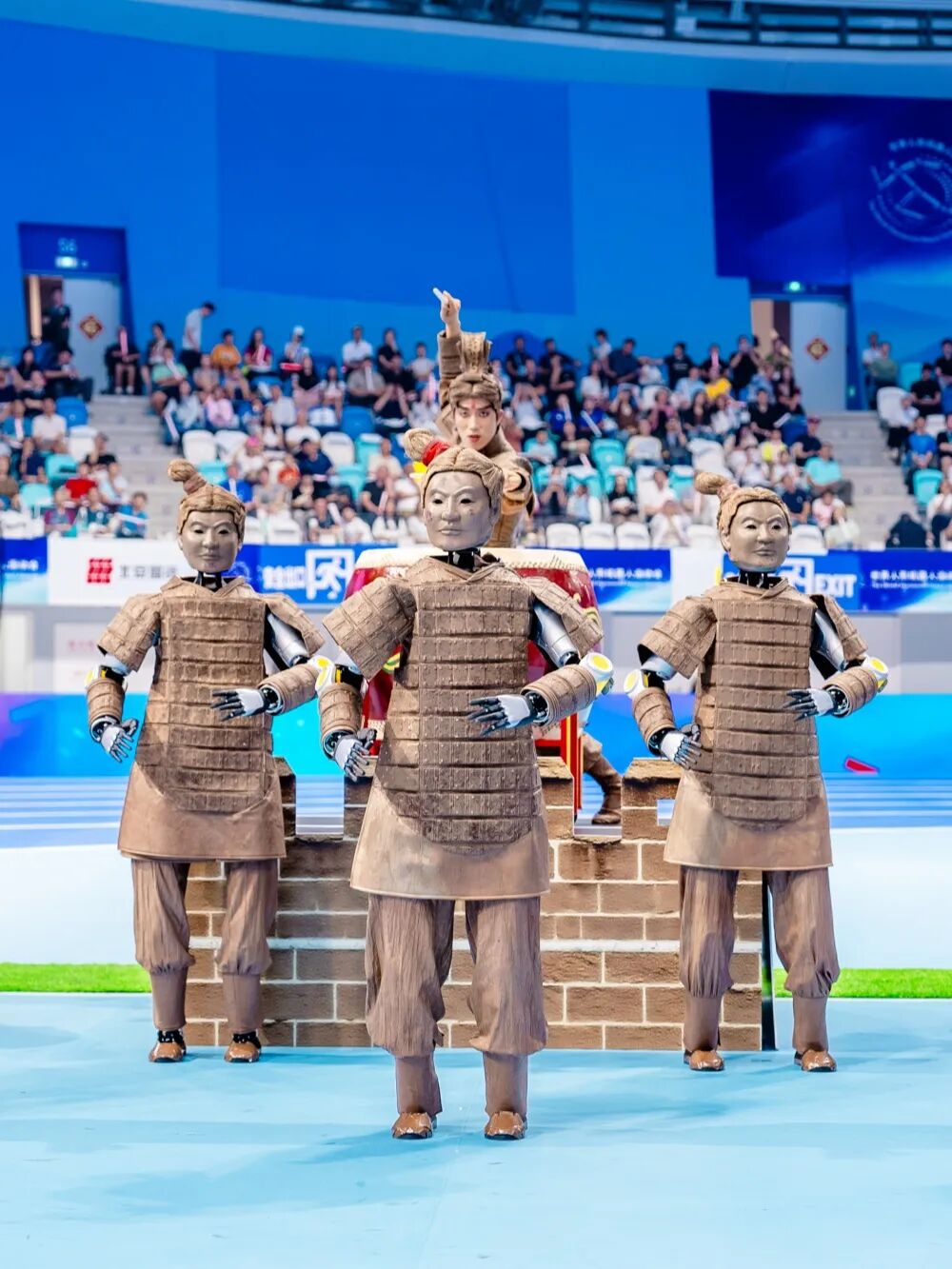 光谷东智研发的“光子”人形机器人化身秦俑,夺得2025世界人形机器人运动会群体舞蹈冠军。 陈蔚然 摄
