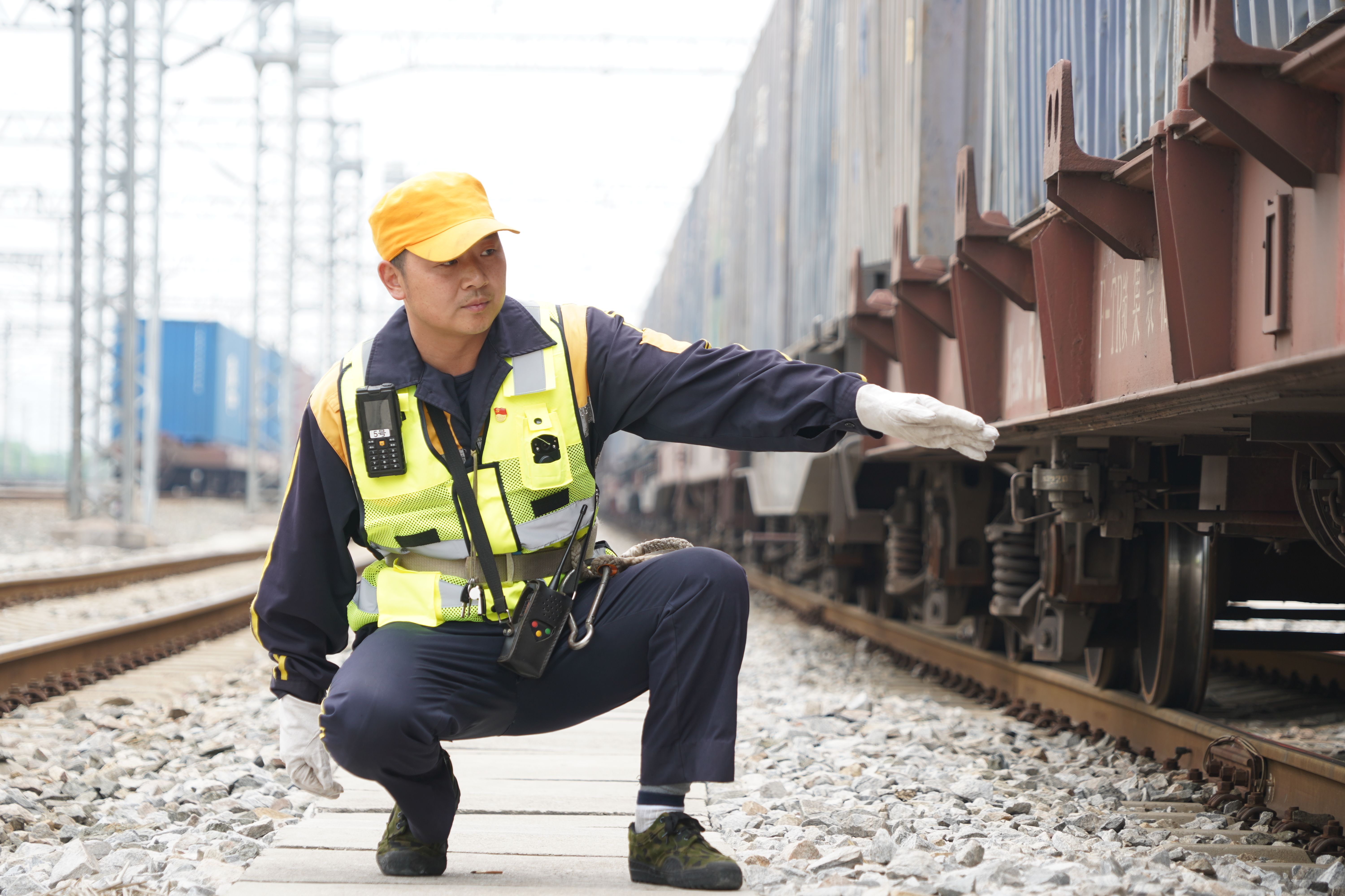 铁路工作人员在检查中欧班列(武汉)的车辆。 通讯员丁旭 摄