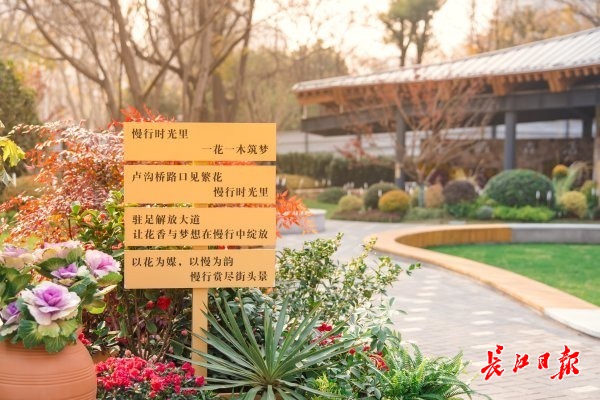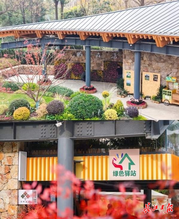 1日,长江日报记者看到,绿色驿站南侧布置了花境、草坪,市民可坐在阶梯状长椅上赏花休闲;东侧、北侧两座小广场,正在举办花卉园艺展示和植物主题市集。