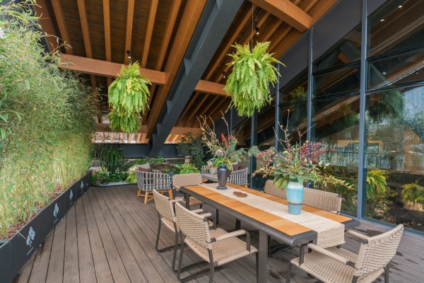 二楼则打造了庭院阳台景观样板,提供家居美化参考。有趣的是,这里还设置了两间自然疗愈室,引导体验者通过闻花香、听音乐放松身心。