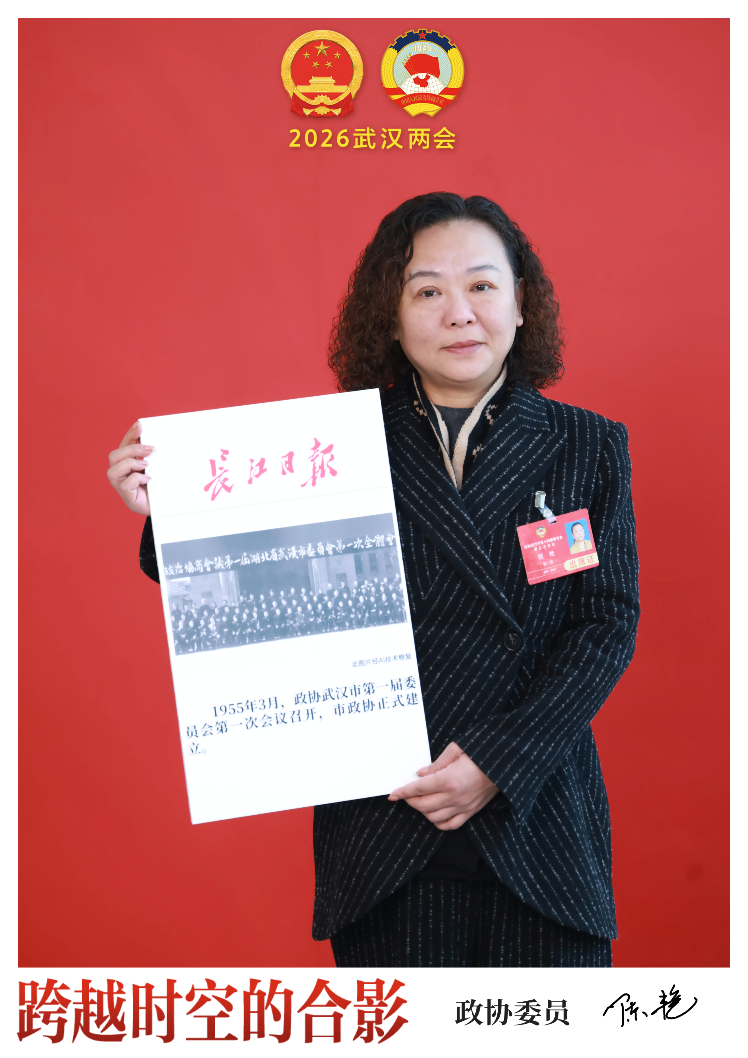 长江日报大武汉客户端1月6日讯(记者樊友寒) 1月5日上午,在长江日报“跨越时空的合影”互动区前,市政协委员、东西湖区人大长青街道工委主任陈艳,与1955年3月召开的政协武汉市第一届委员会第一次会议的珍贵历史影像合影。这张特殊的“老照片”,串联起她自2022年以来扎根民生、践行使命的履职历程。
