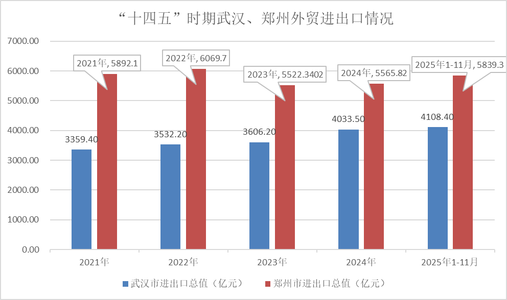 2025年1-11月,武汉市进出口总额达4108.4亿元,超过了2024年全年。