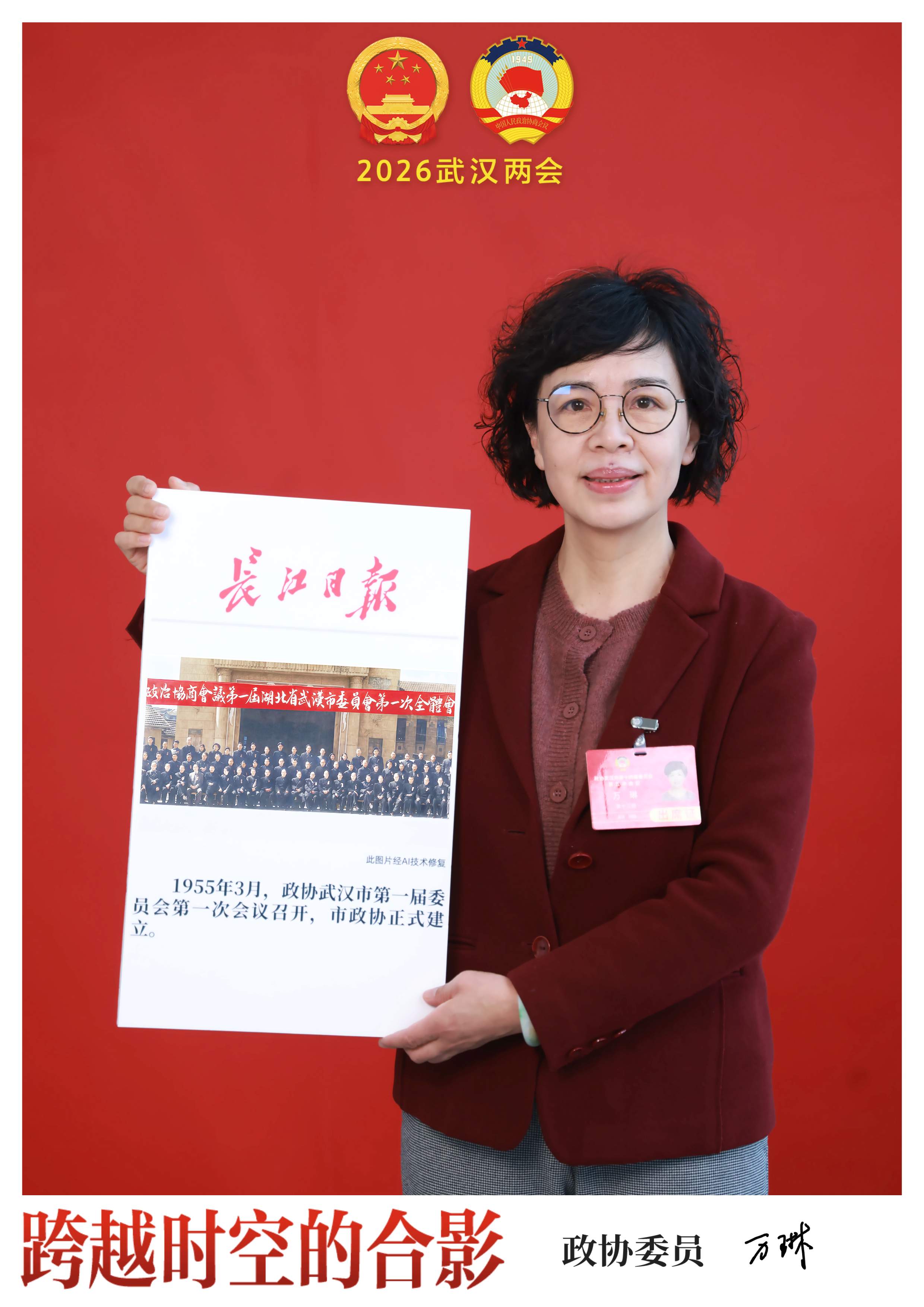1月6日,市政协委员、盘龙城遗址博物院名誉院长万琳在长江日报“跨越时空的合影”互动区站定,与1954年召开的武汉市第一届人民代表大会第一次会议老照片合影。