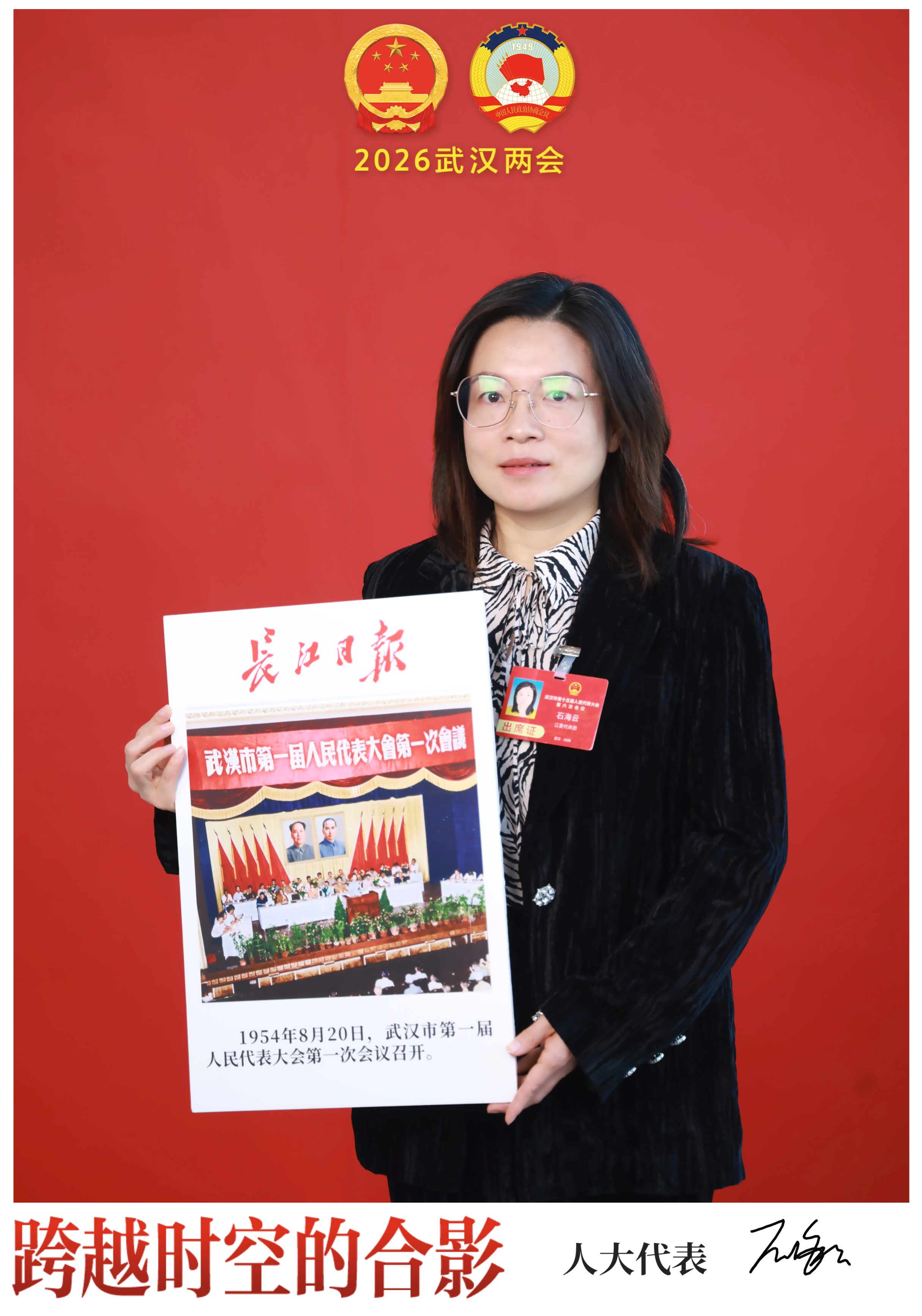 “见证武汉的发展变迁,有一种浓浓的幸福感。”1月6日,在长江日报“跨越时空的合影”互动区,市人大代表、湖北生态工程职业技术学院副校长石海云与70多年前的武汉市第一届人民代表大会第一次会议老照片合影留念。