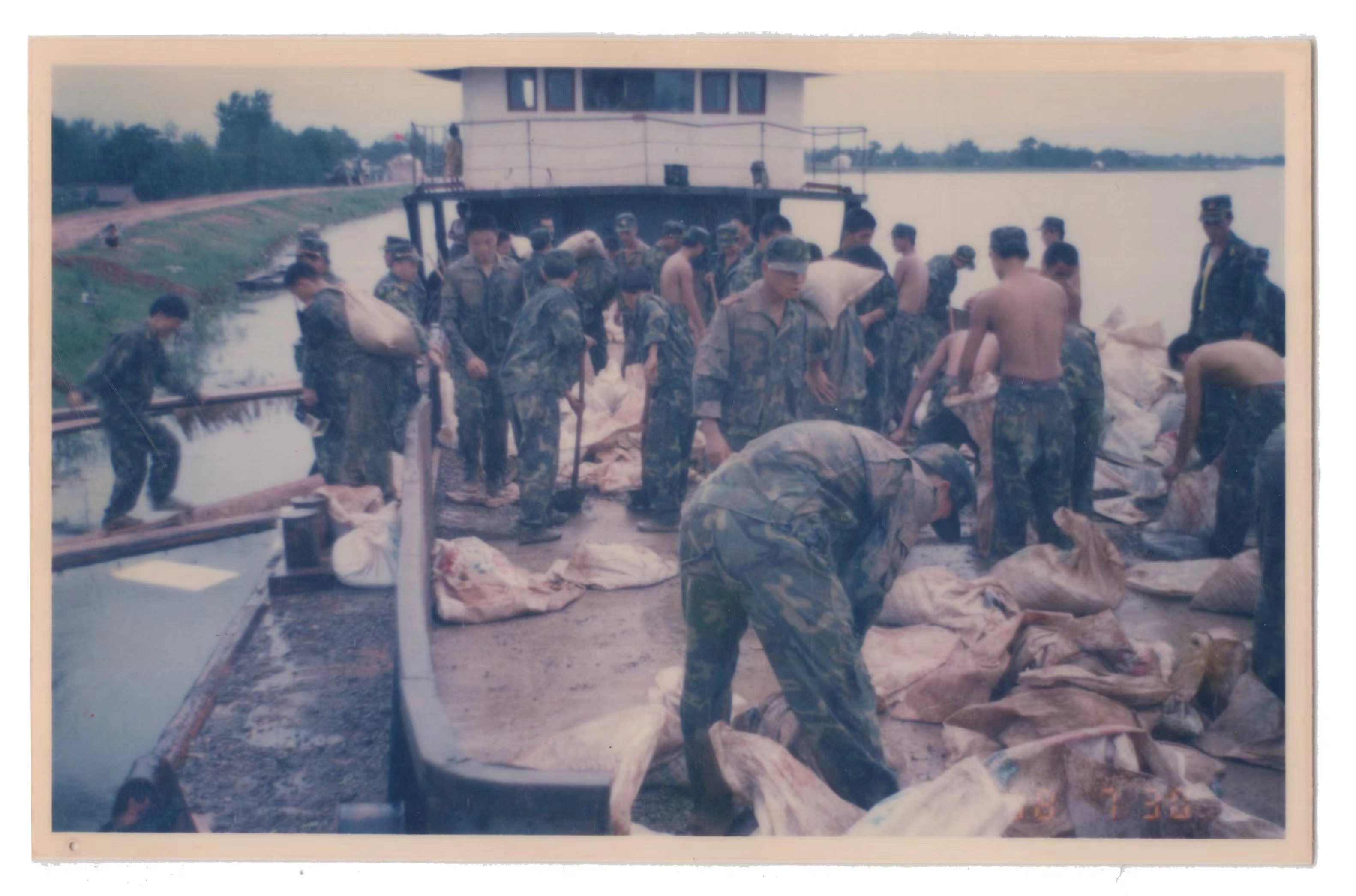 98抗洪期间,官兵们正在搬运沙袋。 方贤松 供图
