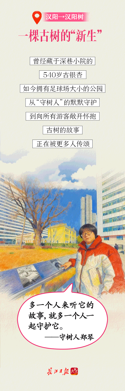 “这是一棵古银杏树,因崔颢诗句‘晴川历历汉阳树’得名,有540多岁,是武汉市主城区最古老的树。”1月6日下午,汉阳树公园,49岁的郑琴向游客讲述汉阳树的故事。
