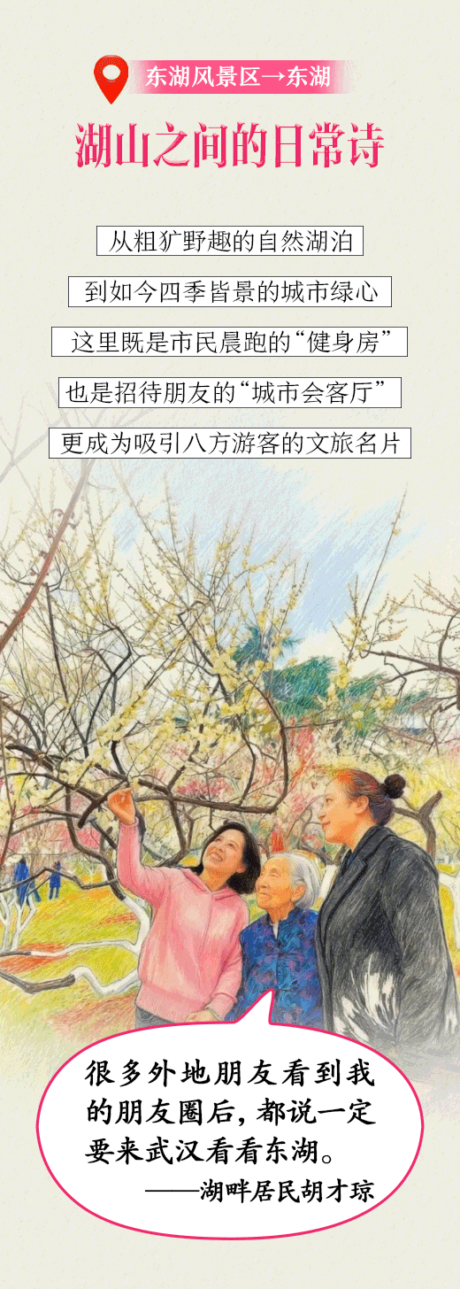 从童年记忆中的粗犷自然,到如今四季皆景的城市名片,胡才琼是东湖变迁的亲历者。“儿时未经规划的湖泊鲜有游人。现在经过改造,春有樱花夏有荷,秋色浸染湖山,冬季梅香暗送,到处是游客的笑声。”她眼中,东湖是生活的一部分:晨跑的跑道、陪伴母亲散步的湖边、和朋友相聚的“会客厅”。