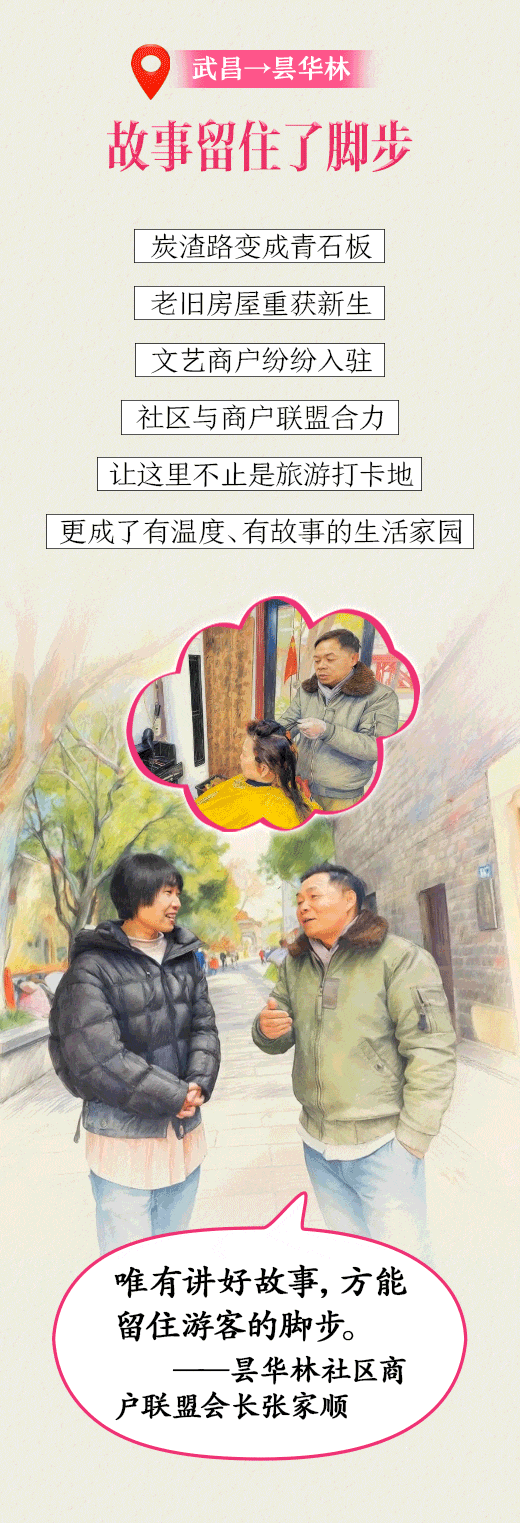 “30年前,我便在此开设理发店,目睹这片街区的蜕变历程。”张家顺回忆道,往昔的昙华林曾是炭渣铺就的道路,雨天积水,房屋破旧。而今经过道路改造、立面整治与管网升级等城市更新工程,街区在“修旧如旧”的理念下焕发新生,既保留了生活气息,又延续了历史脉络,成为全国知名的旅游打卡地。