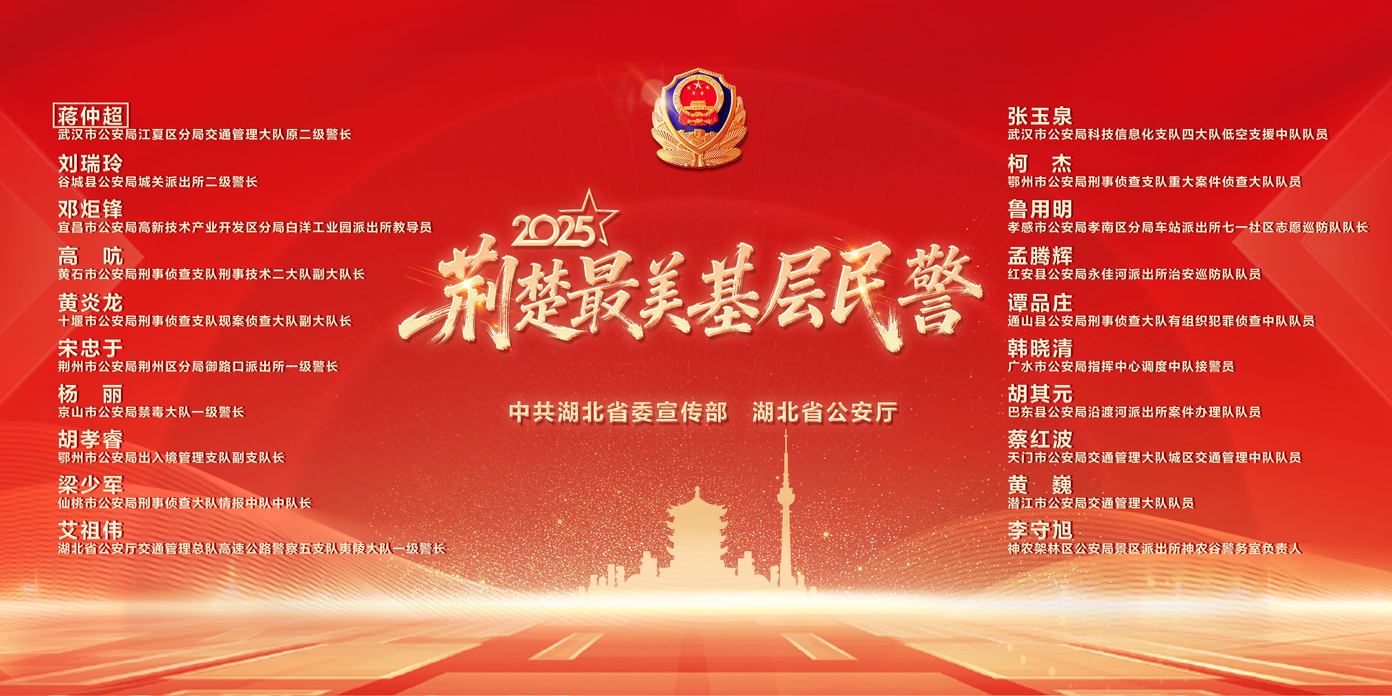 去年8月以来,省委宣传部联合省公安厅组织开展2025“荆楚最美基层民警”推选宣传活动,经层层推荐、严格评审、实地考察,武汉市公安局江夏区分局交通管理大队原二级警长蒋仲超(因公牺牲)、武汉市公安局科技信息化支队四大队低空支援中队队员张玉泉等20名优秀代表脱颖而出,成为“最美”。