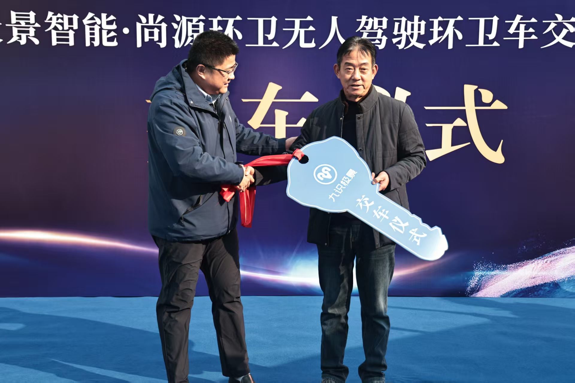 极景智能负责人(左)向无锡尚源环卫负责人交付象征机器人的钥匙。通讯员供图
