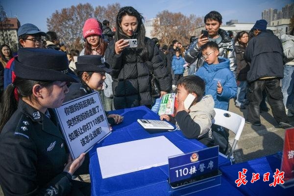在110展台,“110热线电话”模拟场景刚摆出来,桌前排满了前来体验的市民。
