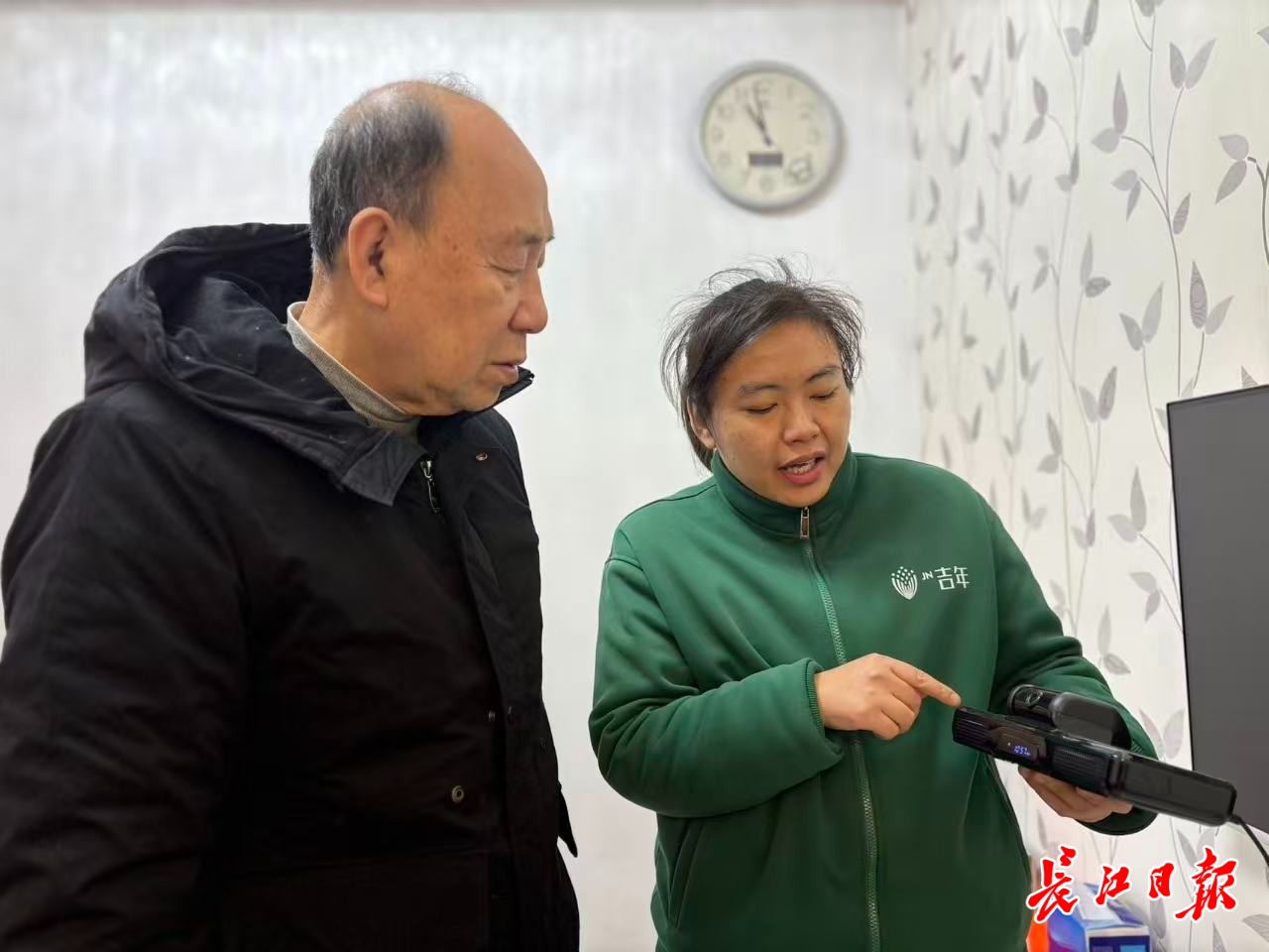 吉年养老服务有限公司工作人员沈思思为民航里社区居民熊爷爷演示设备。记者刘晨玮 摄