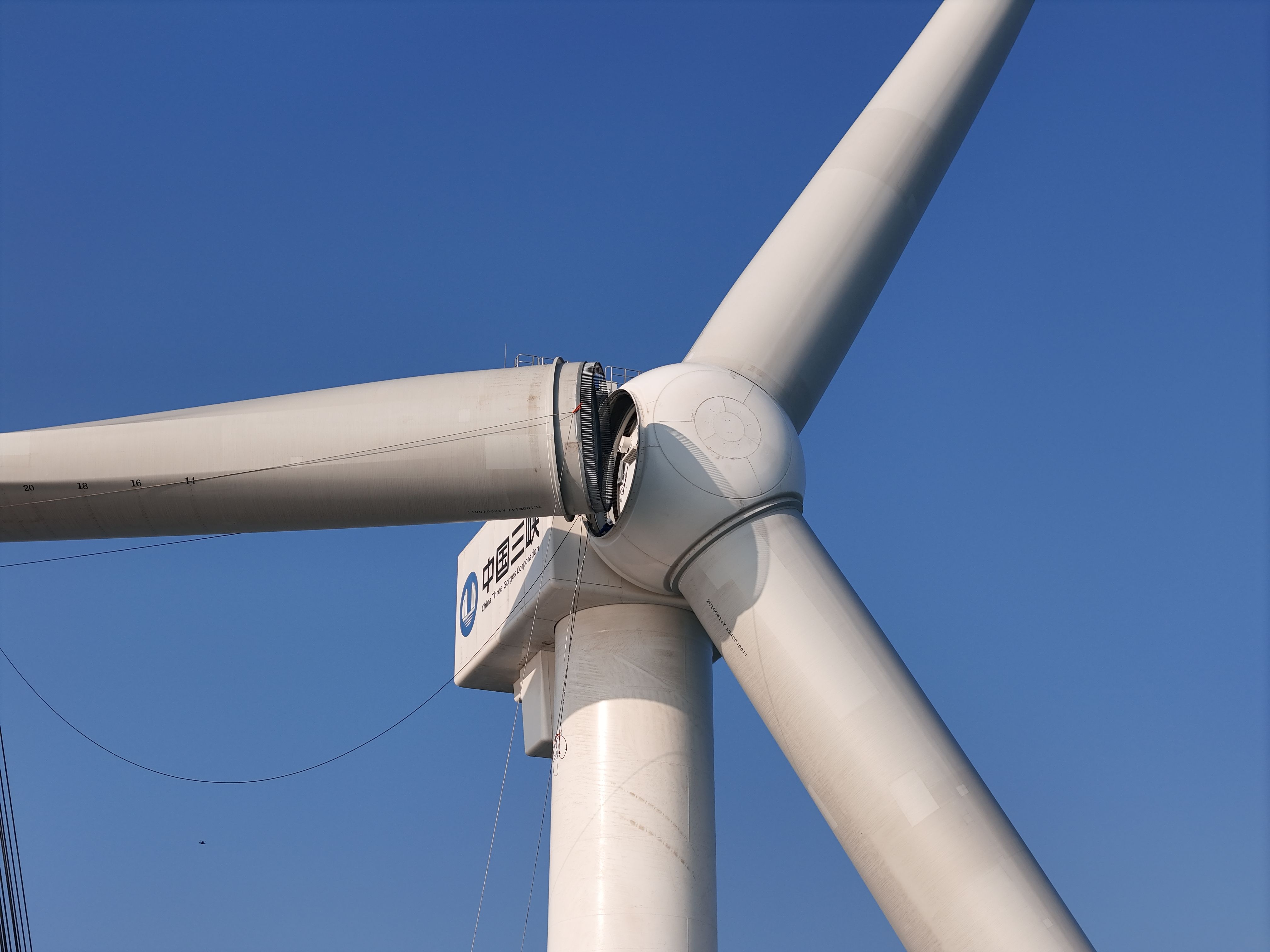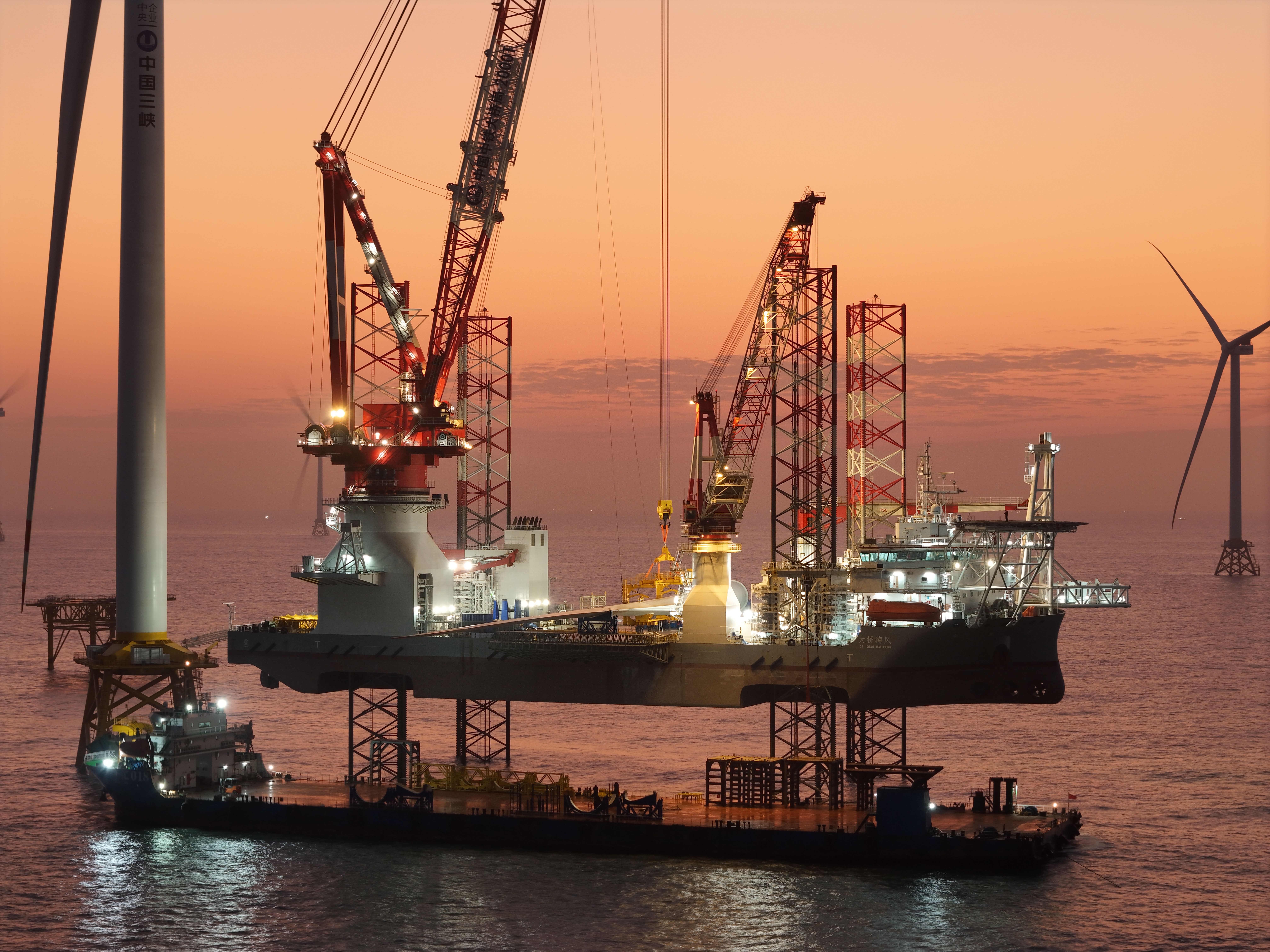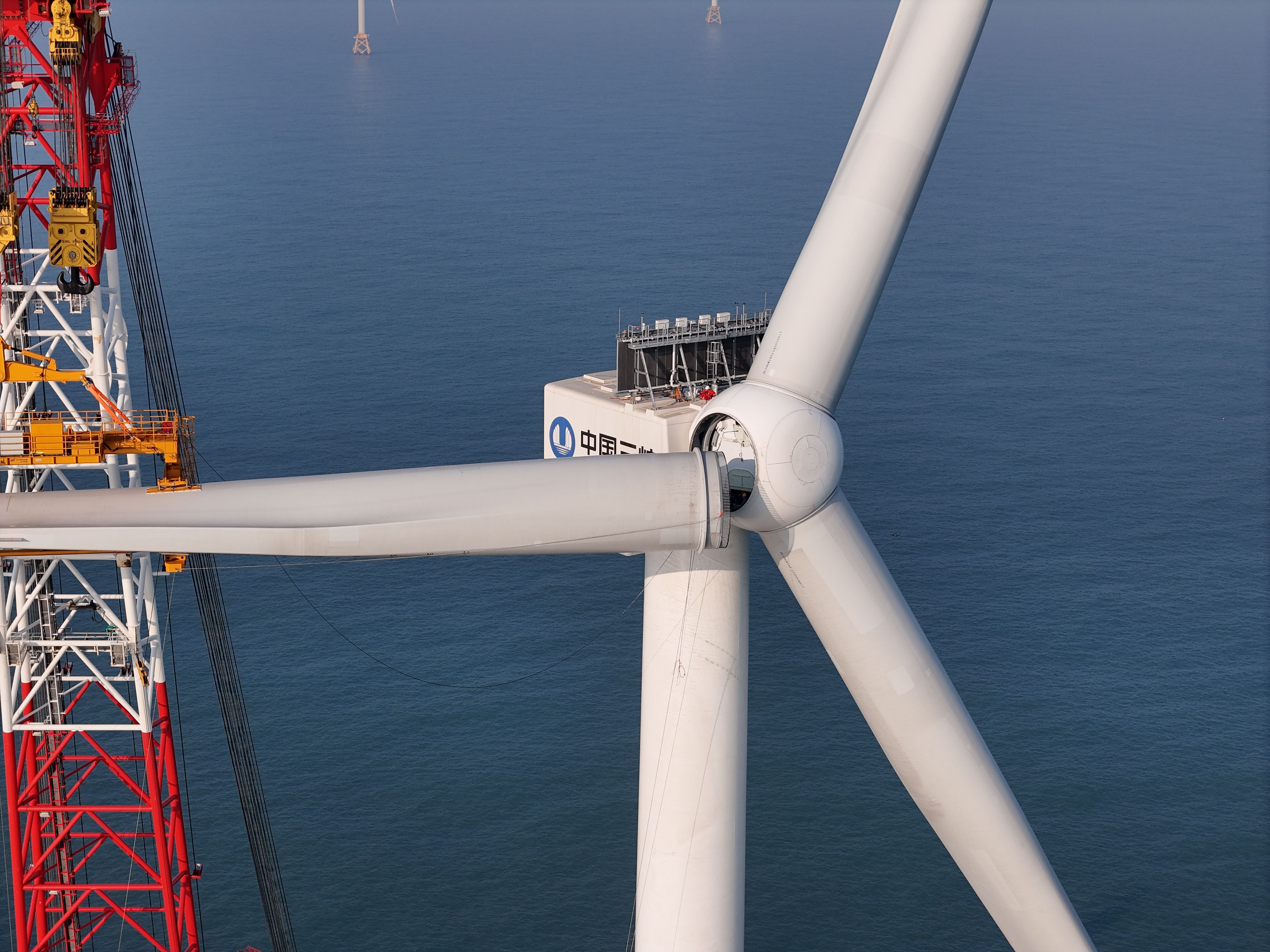 在“大桥海风”号的操控下,风机第三支叶片与机舱轮毂精准对接并完成螺栓紧固,标志着全球首台20兆瓦海上风电机组吊装作业顺利完成。 通讯员周骏威 摄
