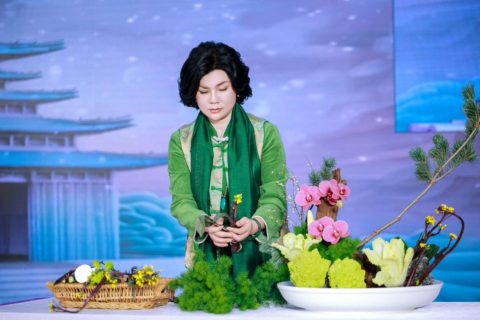 非遗知音花艺代表性传承人柯杏林在现场展示洪山菜薹艺术插花。
