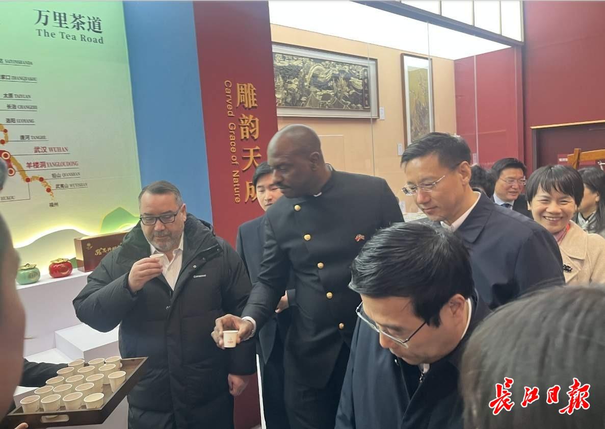 两位大使在荆楚非遗国际会客厅品尝宜昌长盛川青砖茶。 记者万建辉 摄