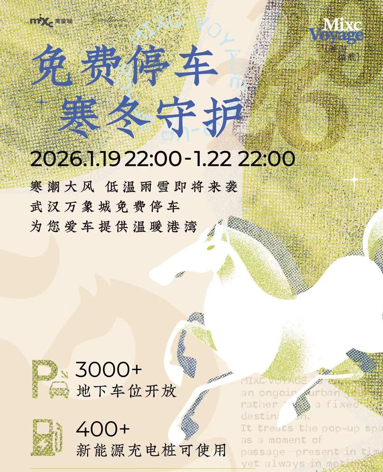 武汉摩尔城:从1月20日至1月22日免费开放地下停车场,车位数量1000个;
