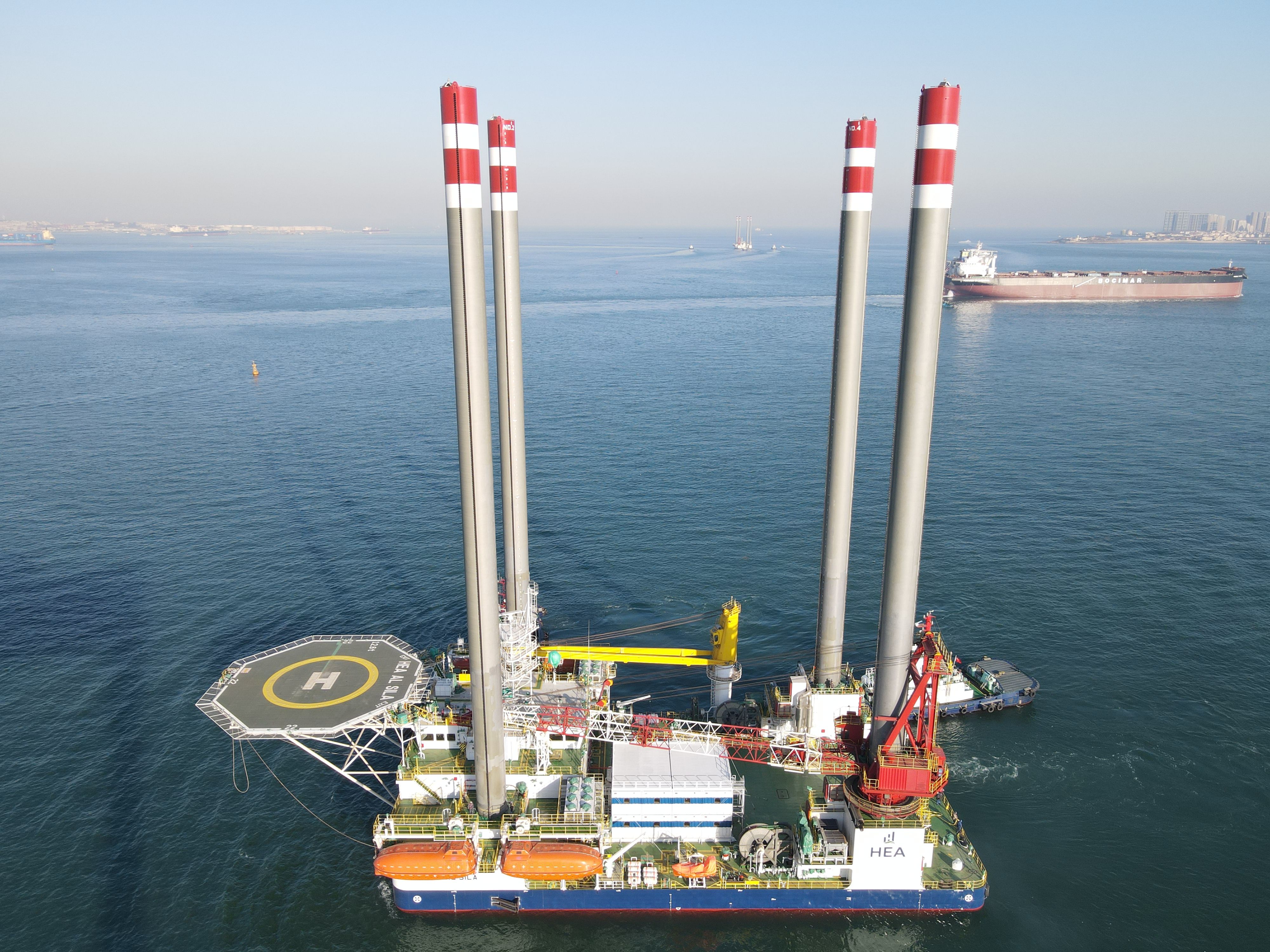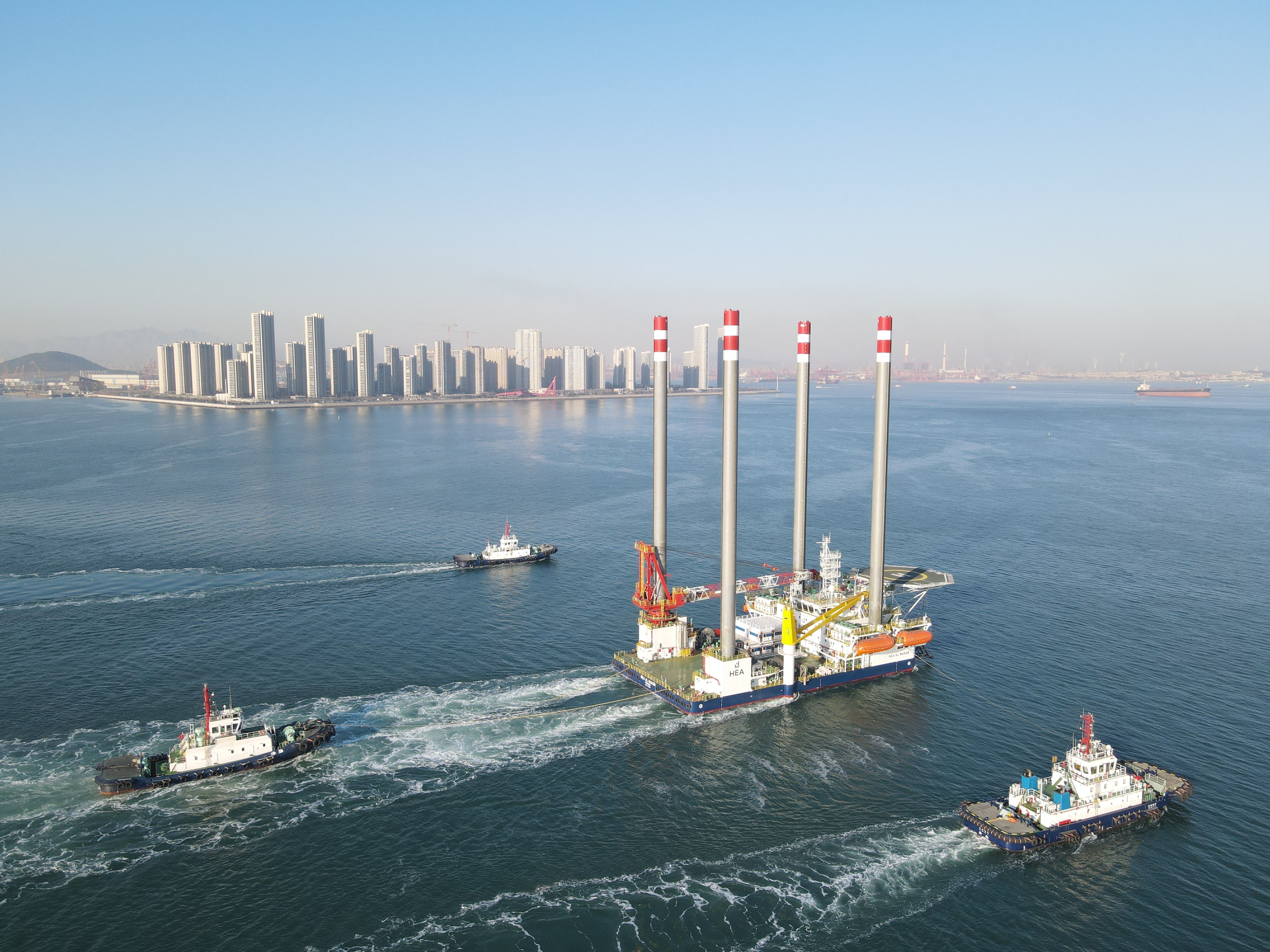 该平台在进行作业时,4条圆柱式圆桩腿深深扎入海底;漂浮移动时,4条圆柱式圆桩腿伸出海面,因此形象被称为“海上移动岛”“海上高脚屋”“海上移动城堡”。