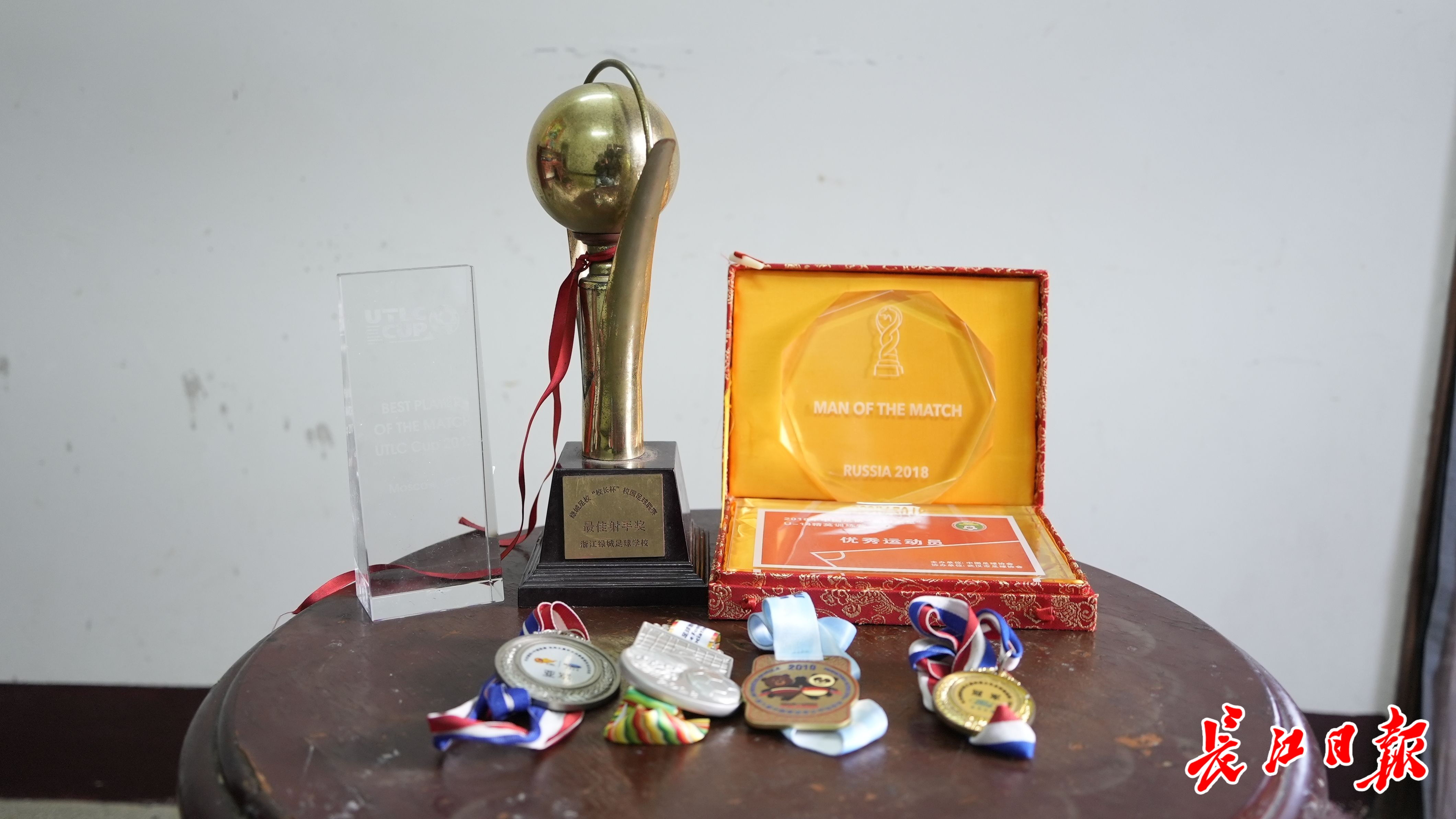 刘浩帆曾经拿到过的奖牌奖杯。 记者高文举 摄