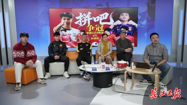 1月24日晚,U23国足队长刘浩帆的父母(右一刘绪全、右二胡冬珍)及启蒙教练杨涛(左二)受邀到长江日报直播间一起观赛。长江日报记者高文举 摄