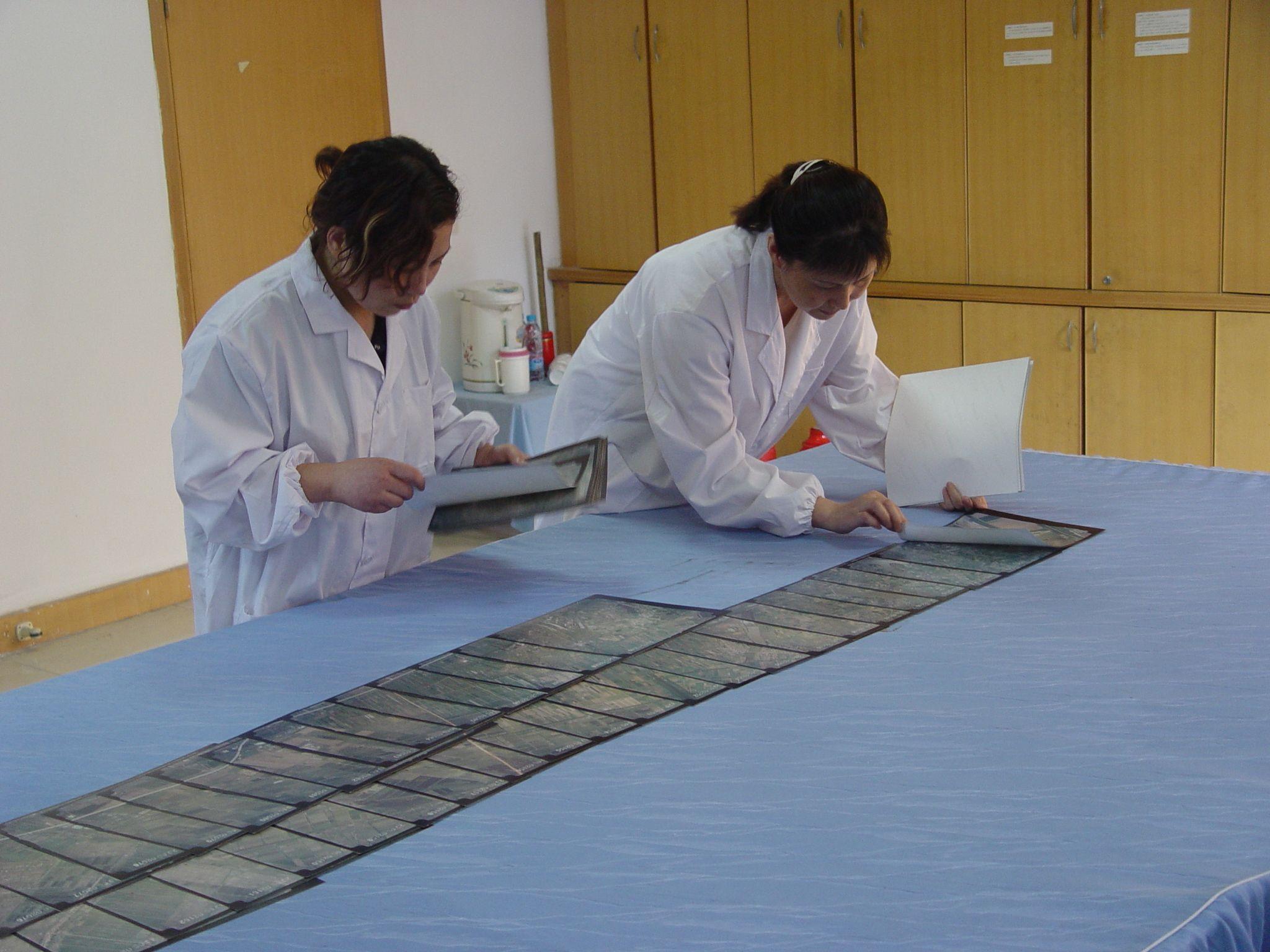 没有电脑自动拼接,他们就把一张张巨大的胶片铺在地板上,趴在地上找地标,找路边的树、房子的角,把不同胶片的重叠部分对齐、粘好。“大家几乎都住在单位,洗照片、看影像,经常加班到凌晨,根本不觉得累。”
