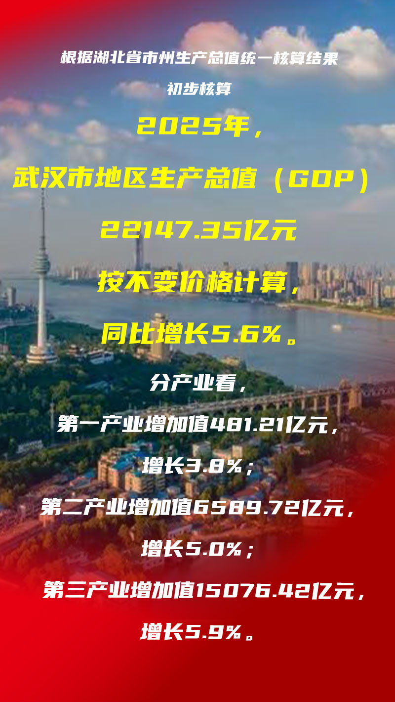 1月28日,武汉市统计局、国家统计局武汉调查队发布2025年武汉市经济运行情况。根据湖北省市州生产总值统一核算结果,初步核算,2025年,武汉市地区生产总值(GDP)22147.35亿元,按不变价格计算,同比增长5.6%。分产业看,第一产业增加值481.21亿元,增长3.8%;第二产业增加值6589.72亿元,增长5.0%;第三产业增加值15076.42亿元,增长5.9%。(文字:连迅;制图:郭亦全)