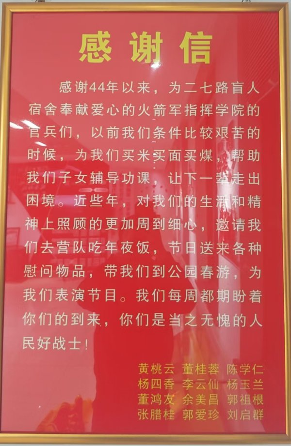 “以前我们条件比较艰苦的时候,官兵为我们买米买面买煤,帮助我们子女辅导功课,让下一辈走出困境。近些年,官兵对我们的生活和精神照顾得更加周到细心,邀我们去营区吃年夜饭,带我们到公园春游,为我们表演节目。”2024年,赶在八一建军节当天,黄桃云等12户盲人家庭联名给“雷锋梯队”送去感谢信:“我们每周都期盼着你们的到来。你们是当之无愧的人民好战士。”