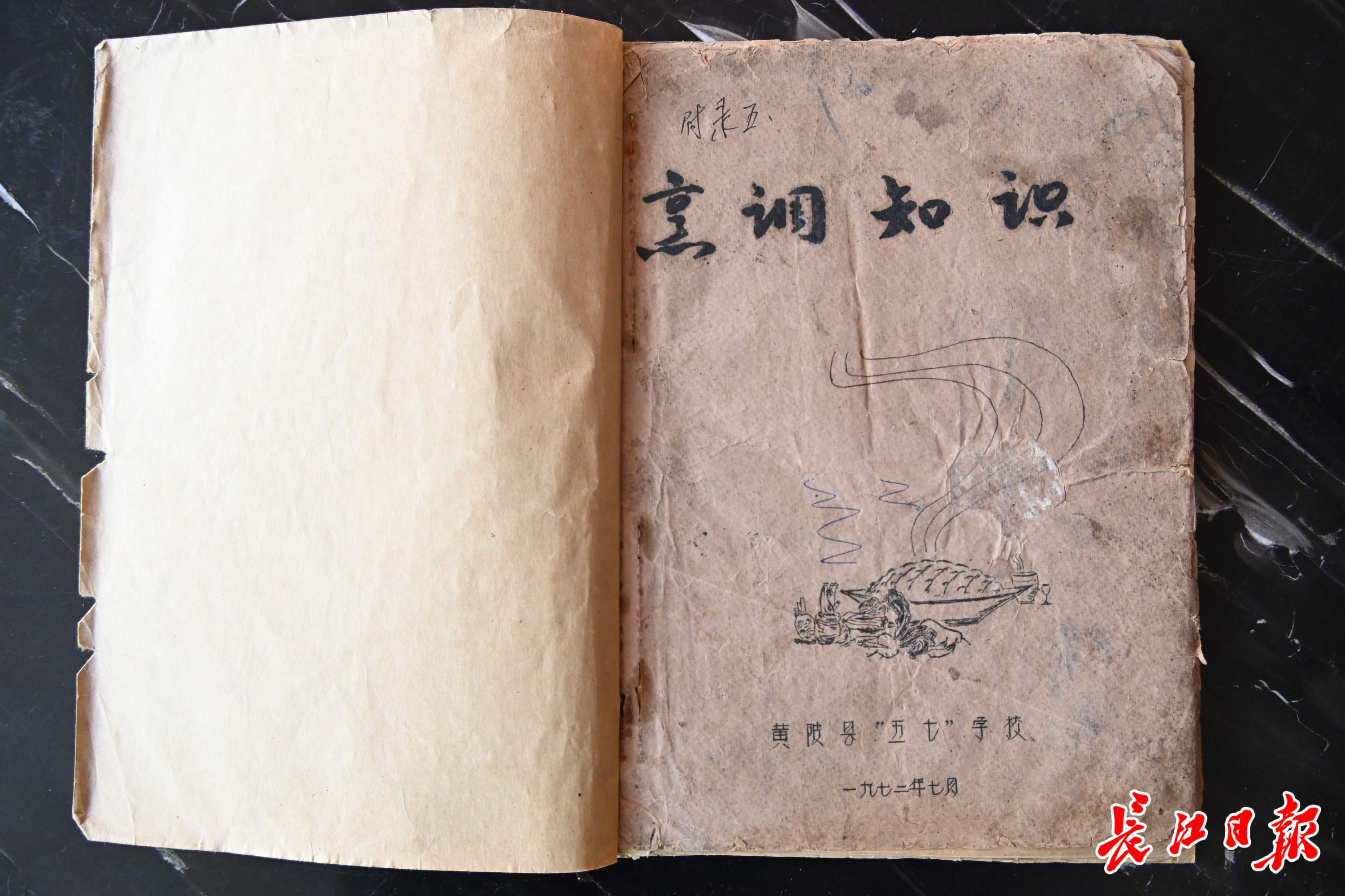 季关运打开保险柜,取出一个牛皮纸信封,从里面掏出用夹子夹住的锡纸袋,又从锡纸袋里拿出一本小册子。册子不厚,正中印着“烹调知识”四个字,落款是黄陂县“五七”学校,一九七二年七月。纸页泛黄,边角微卷。翻开,便是油印的一道道食谱,里面有“黄陂三鲜”的制作方法。
