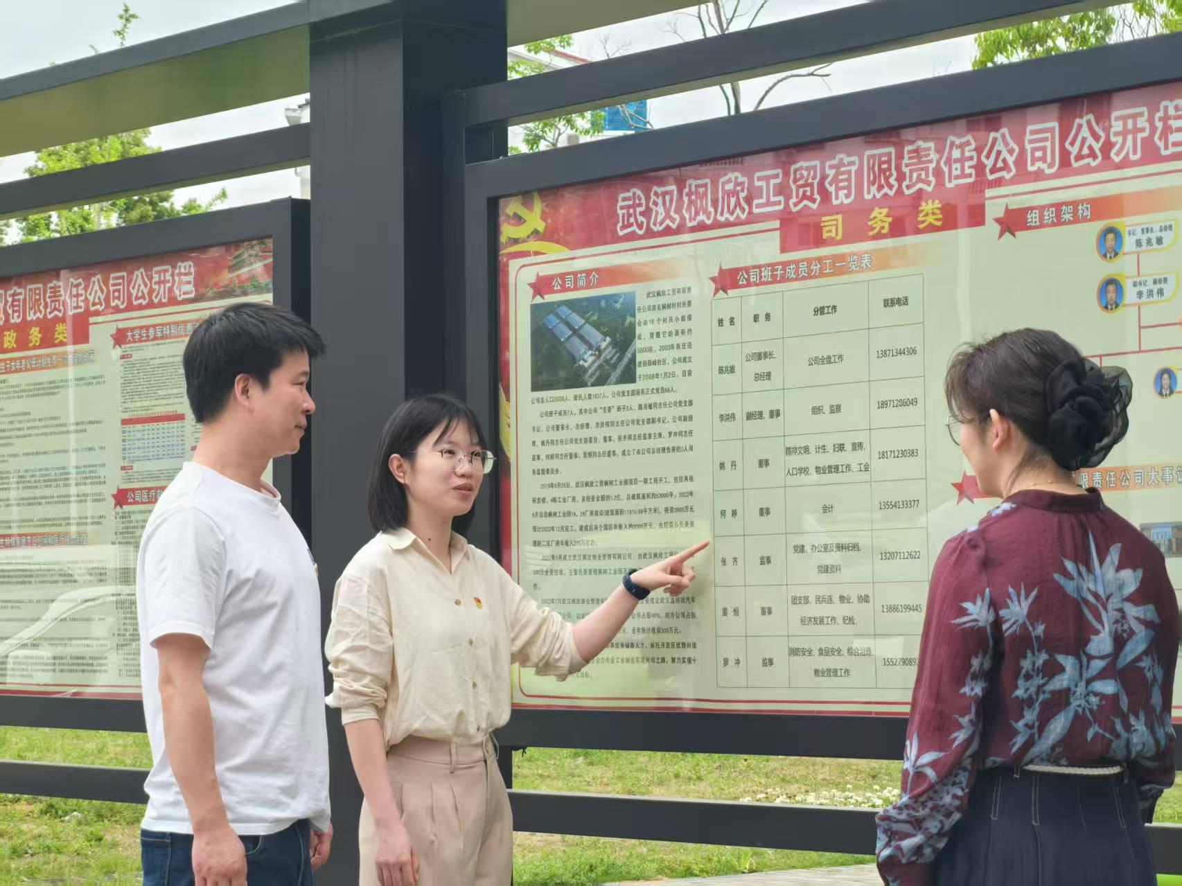 武汉经开区纪检监察工委干部到沌阳街道武汉枫欣工贸有限责任公司查看村集体经济组织“三资”司务公开情况。