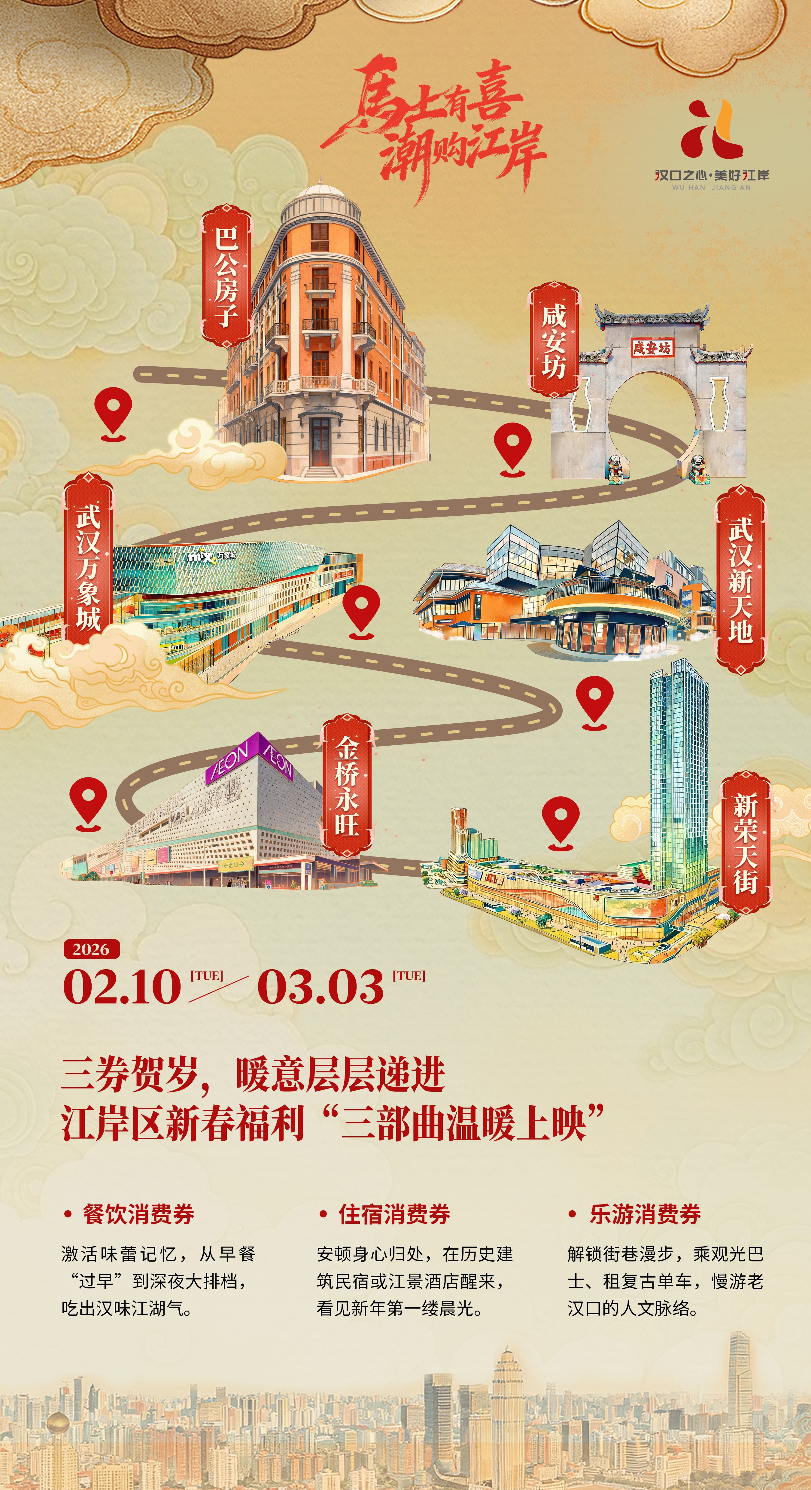 除了发放消费券之外,江岸区策划并组织了首展首演等百余场文化活动,“马上逛非遗 驰骋迎新年”2026年味武汉・非遗贺新春主会场落地江岸区咸安坊,呈现武汉都市圈49项优质非遗项目。黎黄陂路等6处特色商圈商街将设置打卡装置,在“二维马”扫码点,市民扫码即可领取各类消费券。春节假期前,还将有专业摄影师在现场免费为市民游客拍照留念。