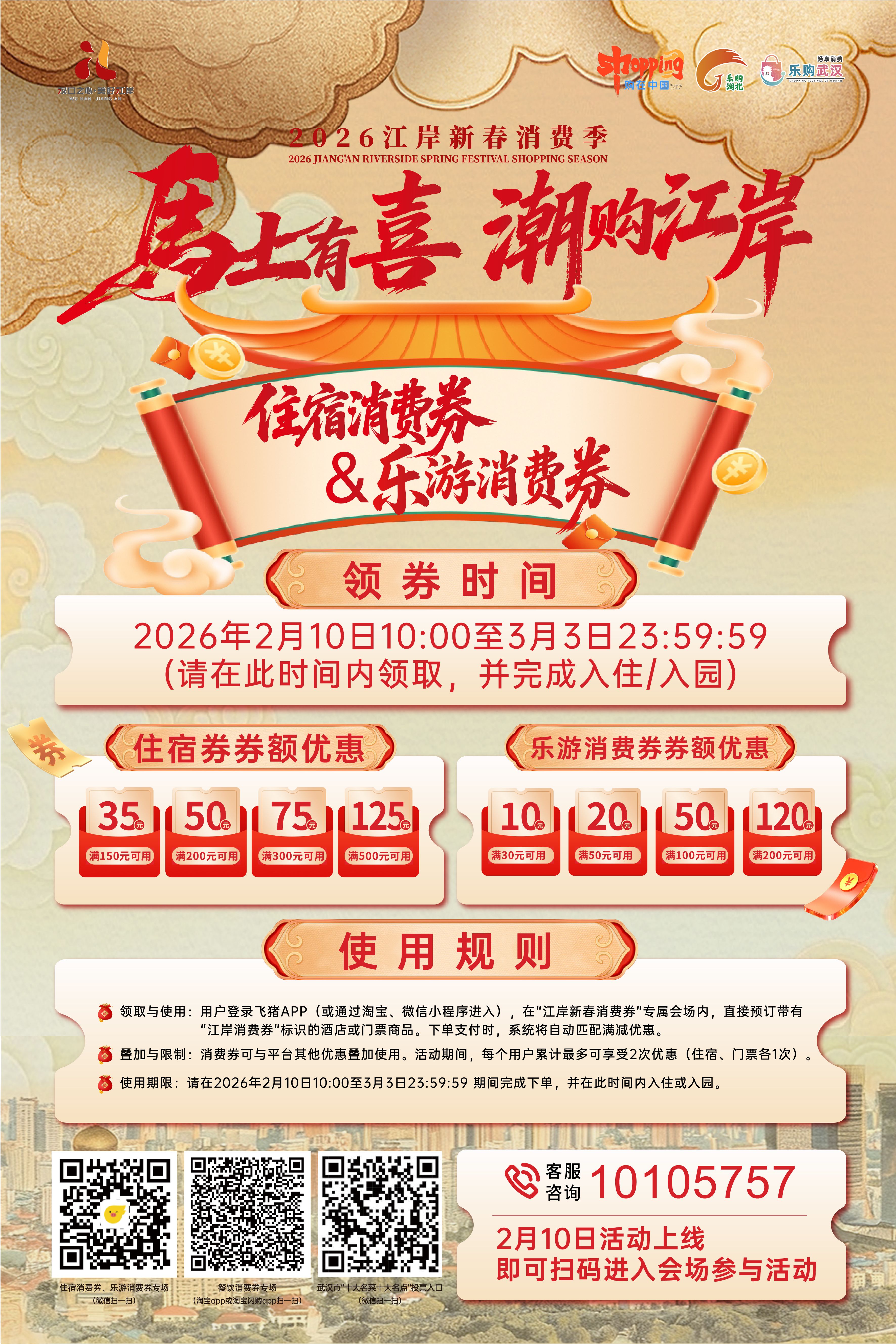 江岸区商务局相关负责人介绍,本次“马上有喜·潮购江岸”包含餐饮、住宿、乐游三大类型新春消费券,市民游客可通过淘宝闪购、飞猪平台领券。餐饮消费券可以用于线上点外卖,也可以线下自提。住宿、乐游消费券可用于各大景区、酒店。全区1000多家商户消费享优惠。