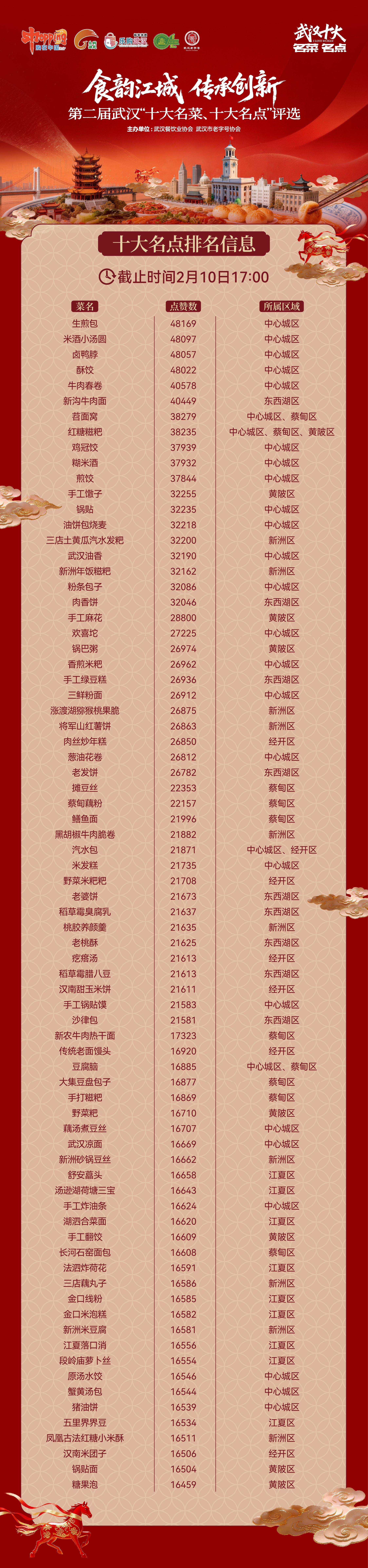 长江日报大武汉客户端2月10日讯 2月10日,第二届武汉“十大名菜、十大名点、十大伴手礼”评选活动实时排名出炉。自2025年12月13日在武汉SKP正式启幕以来,本次评选历经一个多月严谨遴选,社会关注度持续攀升,成为彰显汉派美食与文化魅力、凝聚城市烟火气息的重要平台。