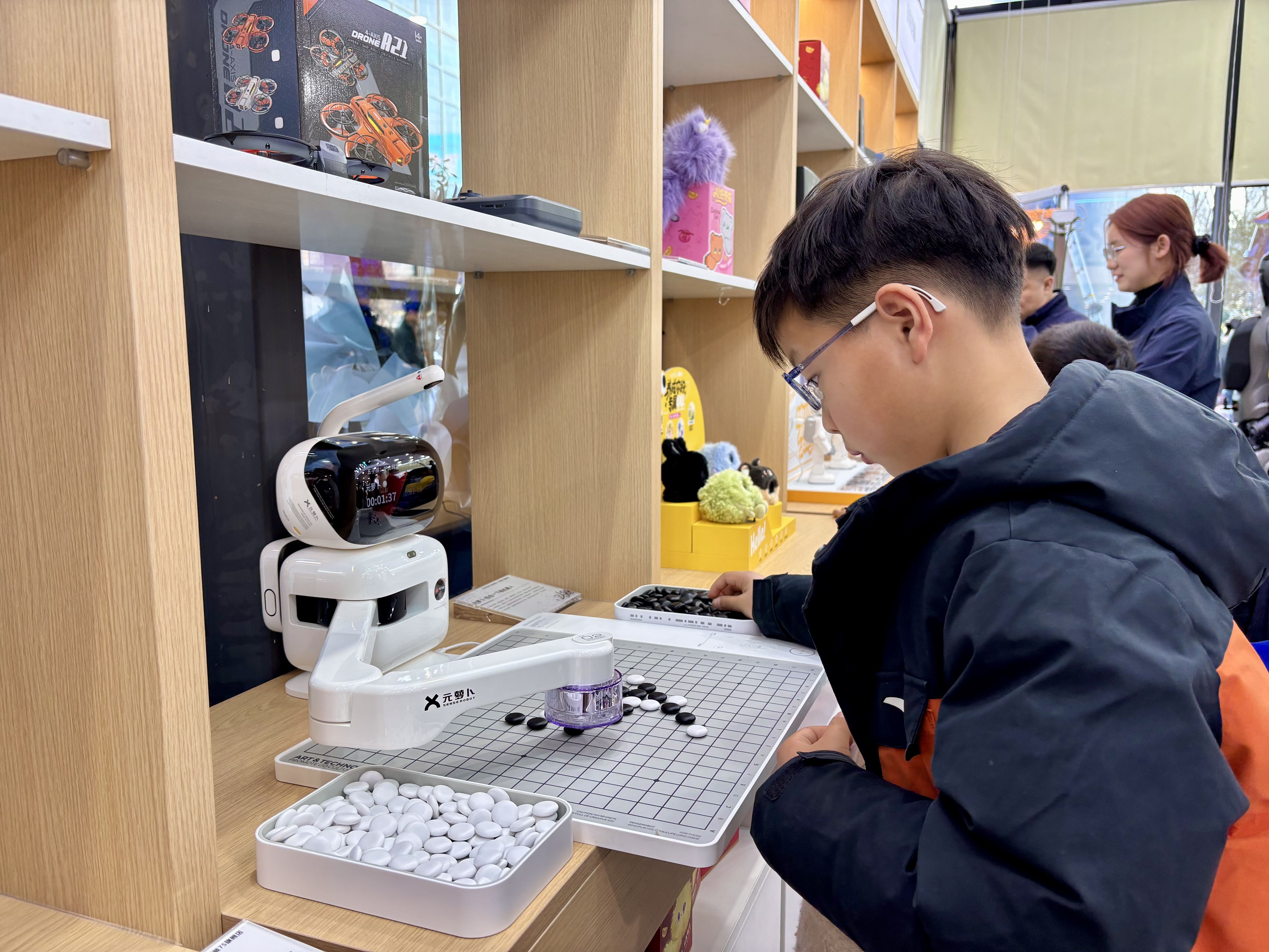 在体验区,一位沉默的机器人“棋手”正与小朋友隔盘对弈,吸引众多市民驻足观看。借助精确定位与视觉识别技术,这位“背熟”海量棋谱的对手能瞬间洞悉棋局变化,从容完成取子、落子等一系列行云流水的操作。