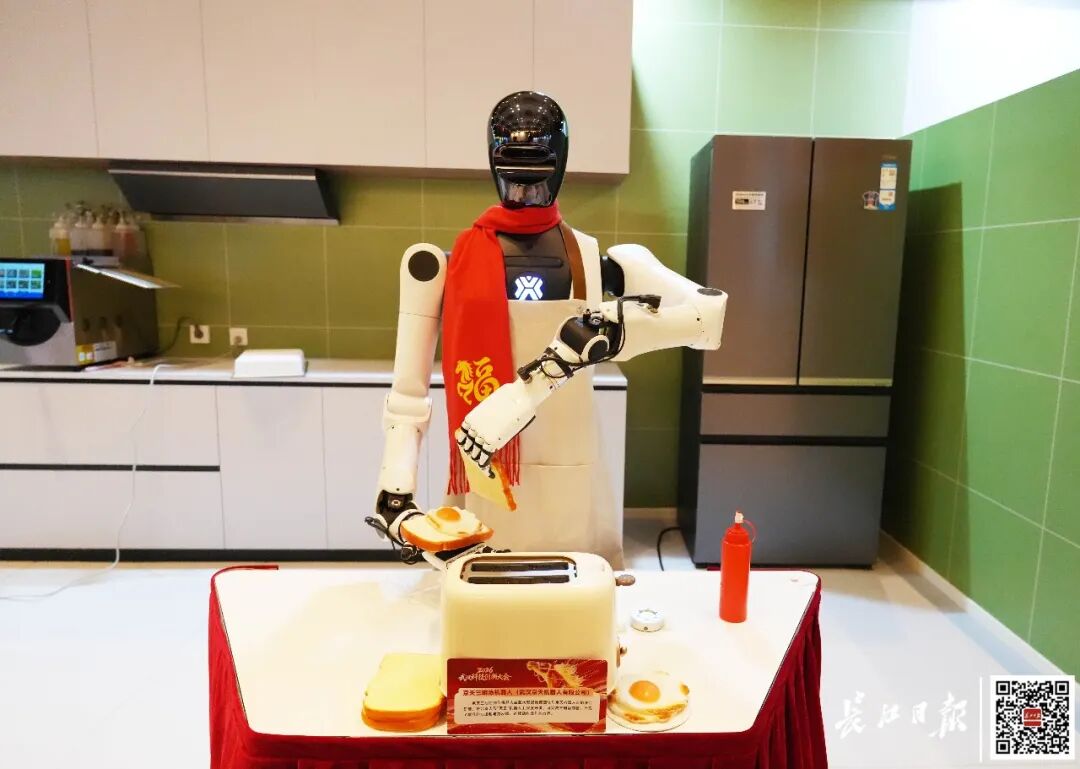 今天下午2026年全市科技创新大会的核心展示单元——未来家庭新春展演举行汉研汉产机器人与前沿科技带来沉浸式体验荆楚、启灵、光谷东智等本地机器人各展所长编队跳舞、协同演奏做三明治尽显硬核实力