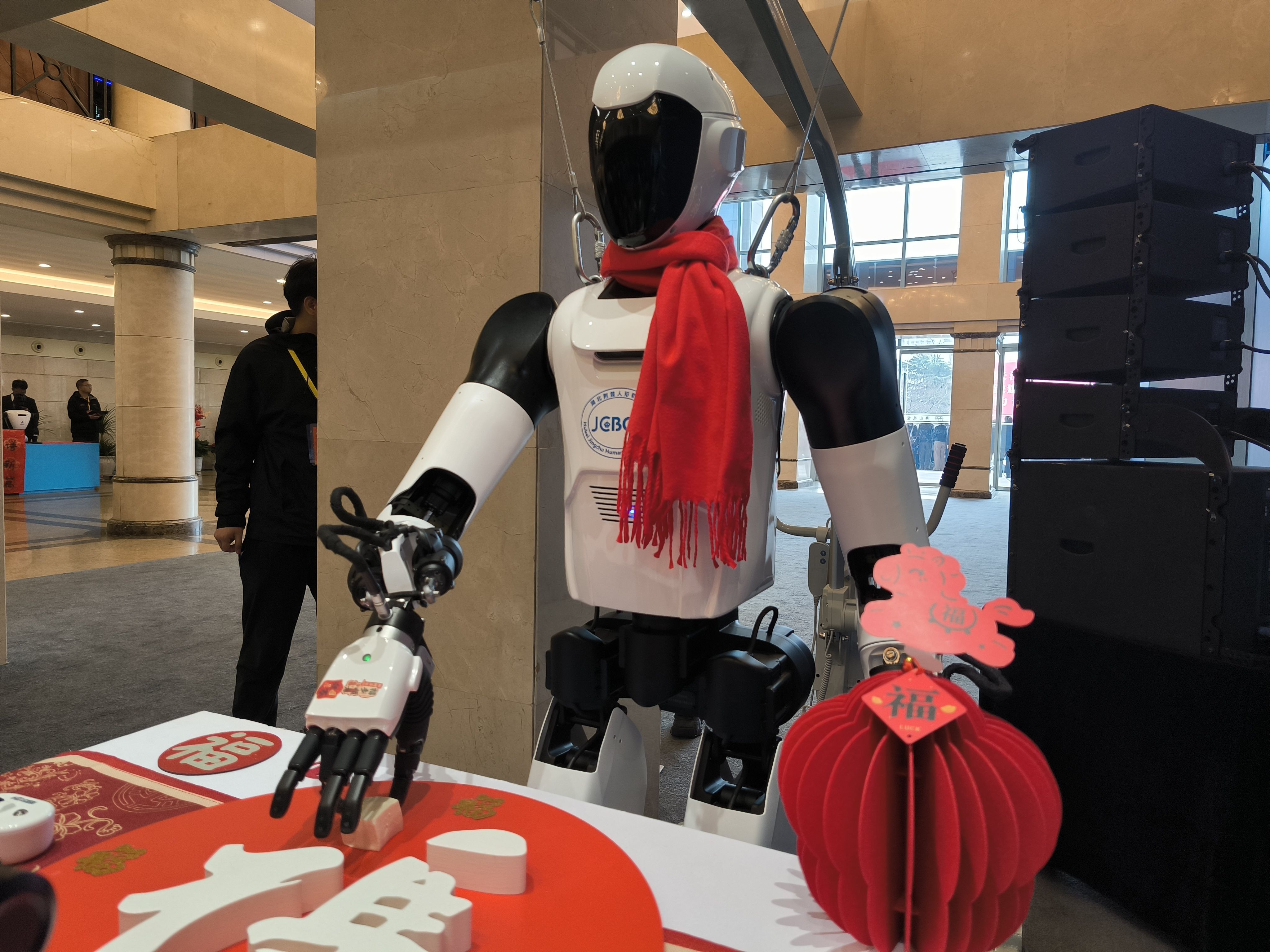 2月24日,丙午马年正月初八,春节后上班第一天。在湖北“新春第一会”现场。九派新闻记者看到“荆楚”系列人形机器人正用一双“灵巧手”,轻轻拈起一块嫩豆腐,稳稳放在“福”字的点上。豆腐未碎,字已成形。