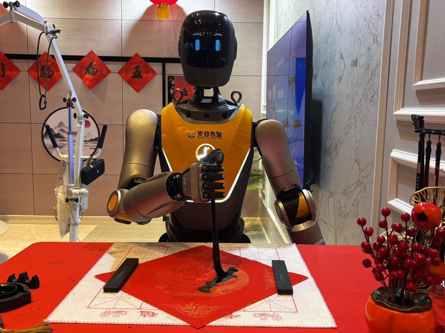 光谷东智品牌总监陈蔚然介绍,在她身后的光子H1人形机器人身高近1.7米,不仅能书写“福”字草书,还能服务于展厅和商超导览、问询,以及商演展出。此前,它曾凭借人机共舞《秦俑魂》,获得首届世界人形机器人运动会首金。“同时,它还在湖北两会、湖北春晚及湖北戏曲春晚表演节目,获得了大家一致的喜爱。”