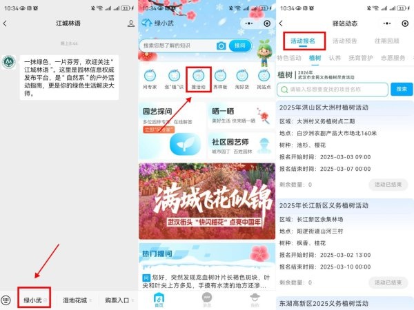今年义务植树活动主题为“绿动武汉 ‘碳’索美好”。市民关注“江城林语”微信公众号,点击菜单栏“绿小武”服务进入小程序,或直接搜索“绿小武”小程序,在“搜活动”栏目中浏览详情即可预约报名。