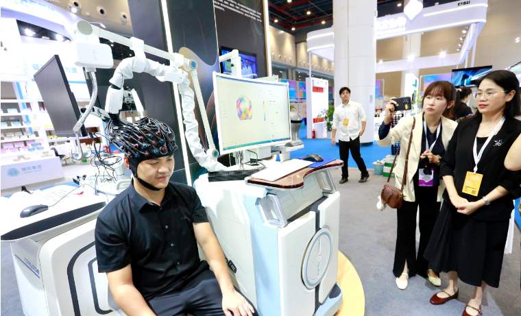 依瑞德展出的交互式脑机—光磁联合设备引人注目。柯志刚 摄