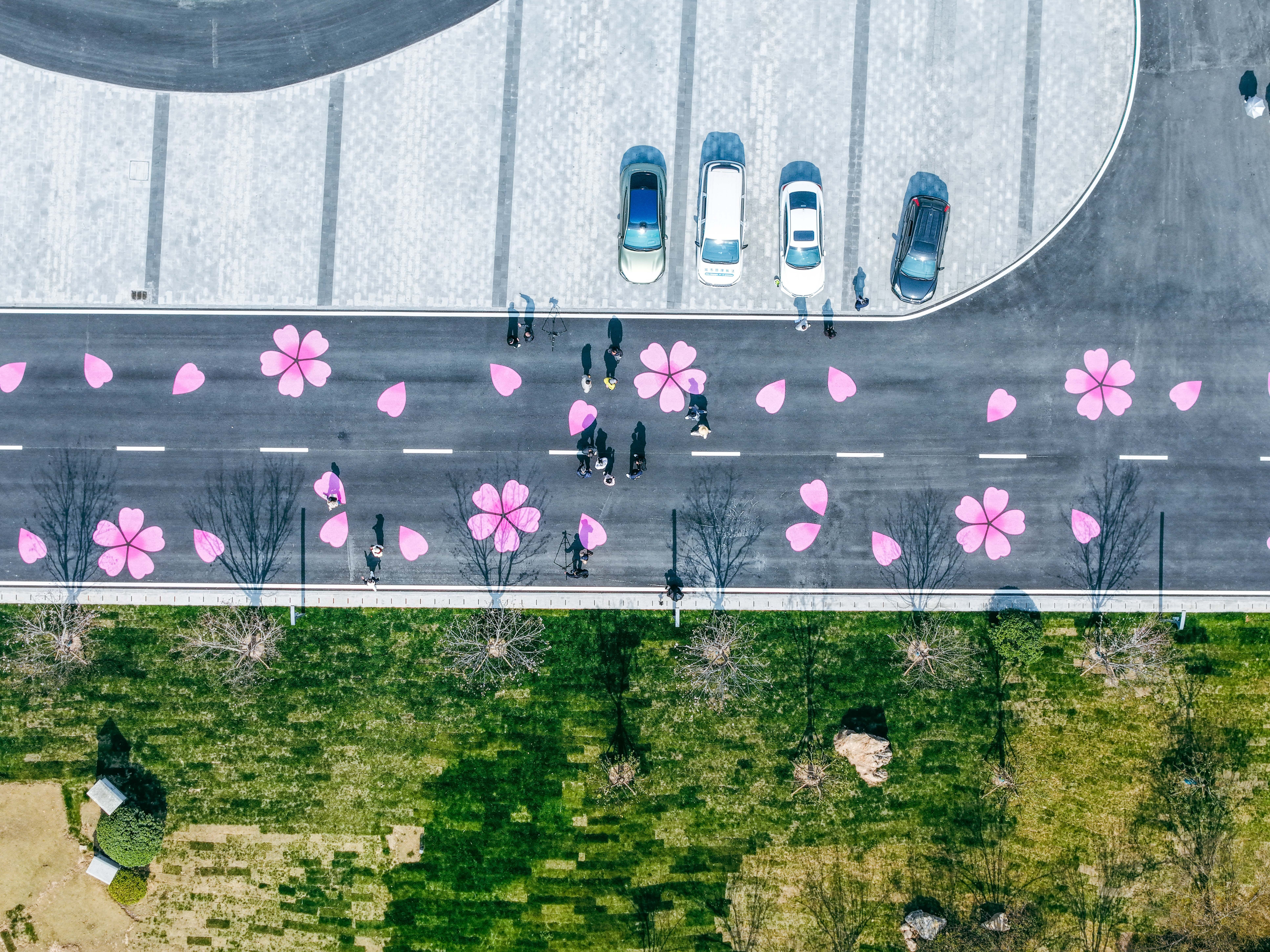 终点青山江滩地面绘制大朵樱花。记者陶常宁 摄