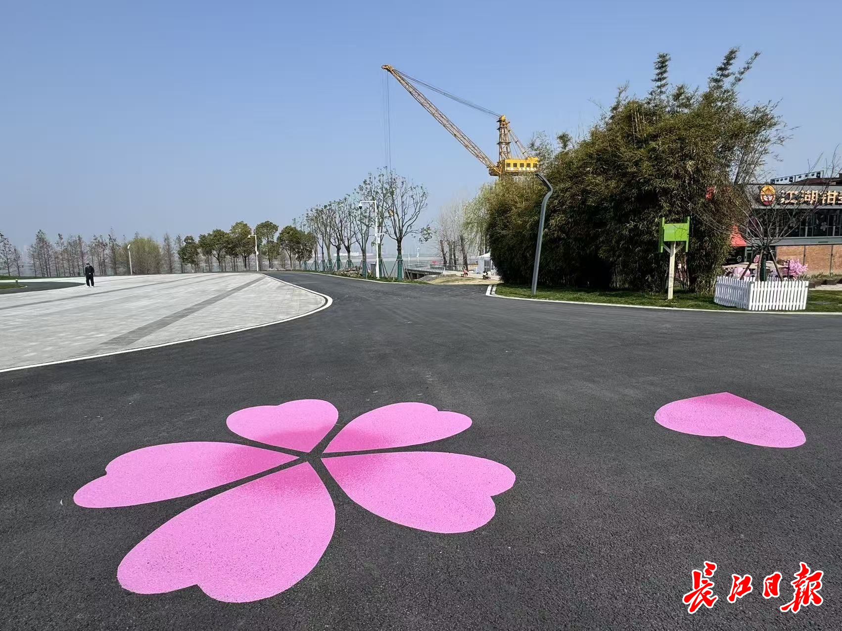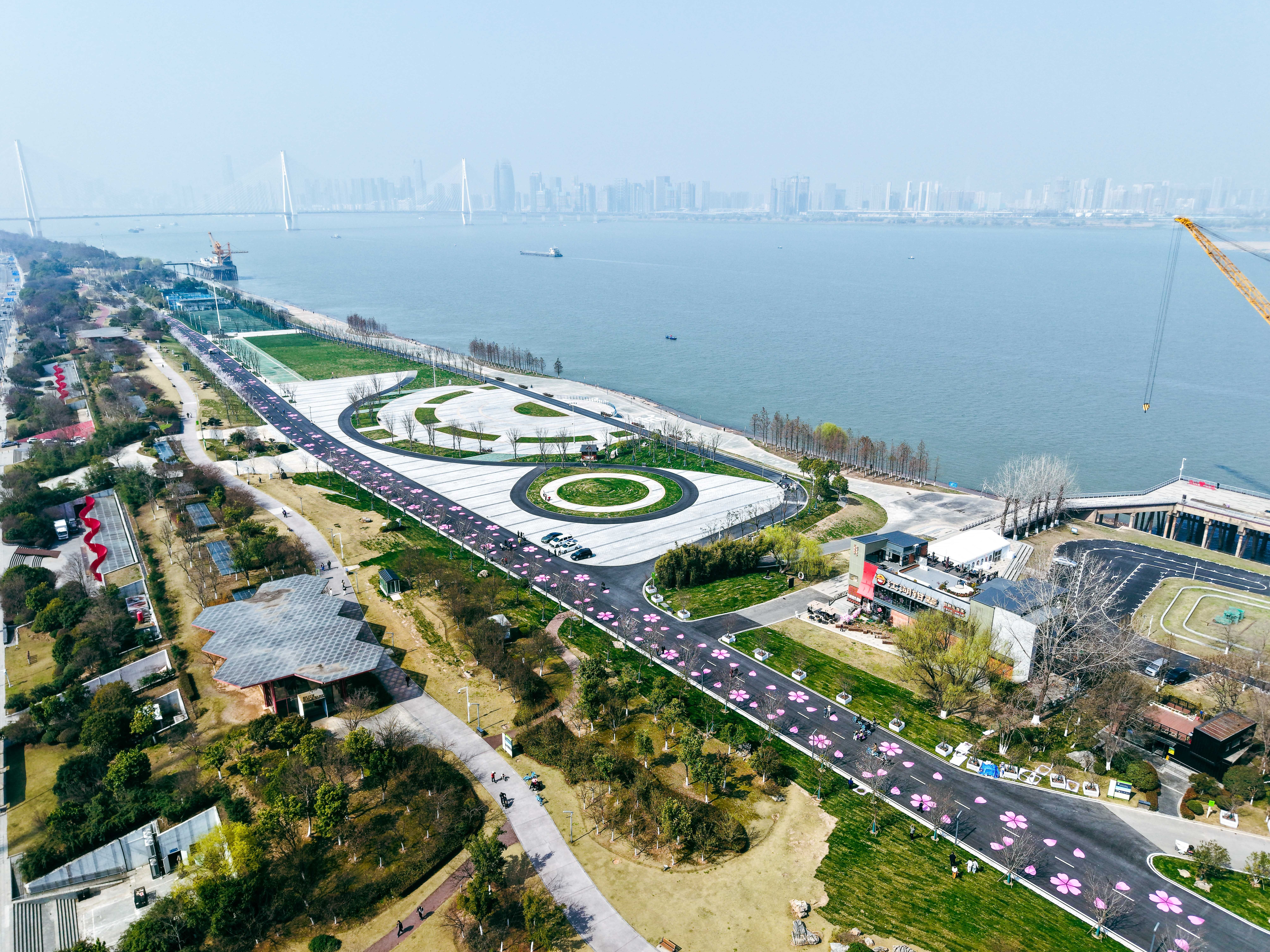 在汉马终点青山江滩,记者看到路面“开出”朵朵樱花,大片樱花彩绘沿赛道蔓延,沿途栽种的樱花已陆续绽放。施工方碧水集团项目负责人介绍,此次改造坚持“微改造”原则,尽可能少动土、多留绿。左侧大草坪完整保留,广场中利用原有树木回植为可移动树池,既满足赛事需求,又最大限度地保护了江滩的生态底色。