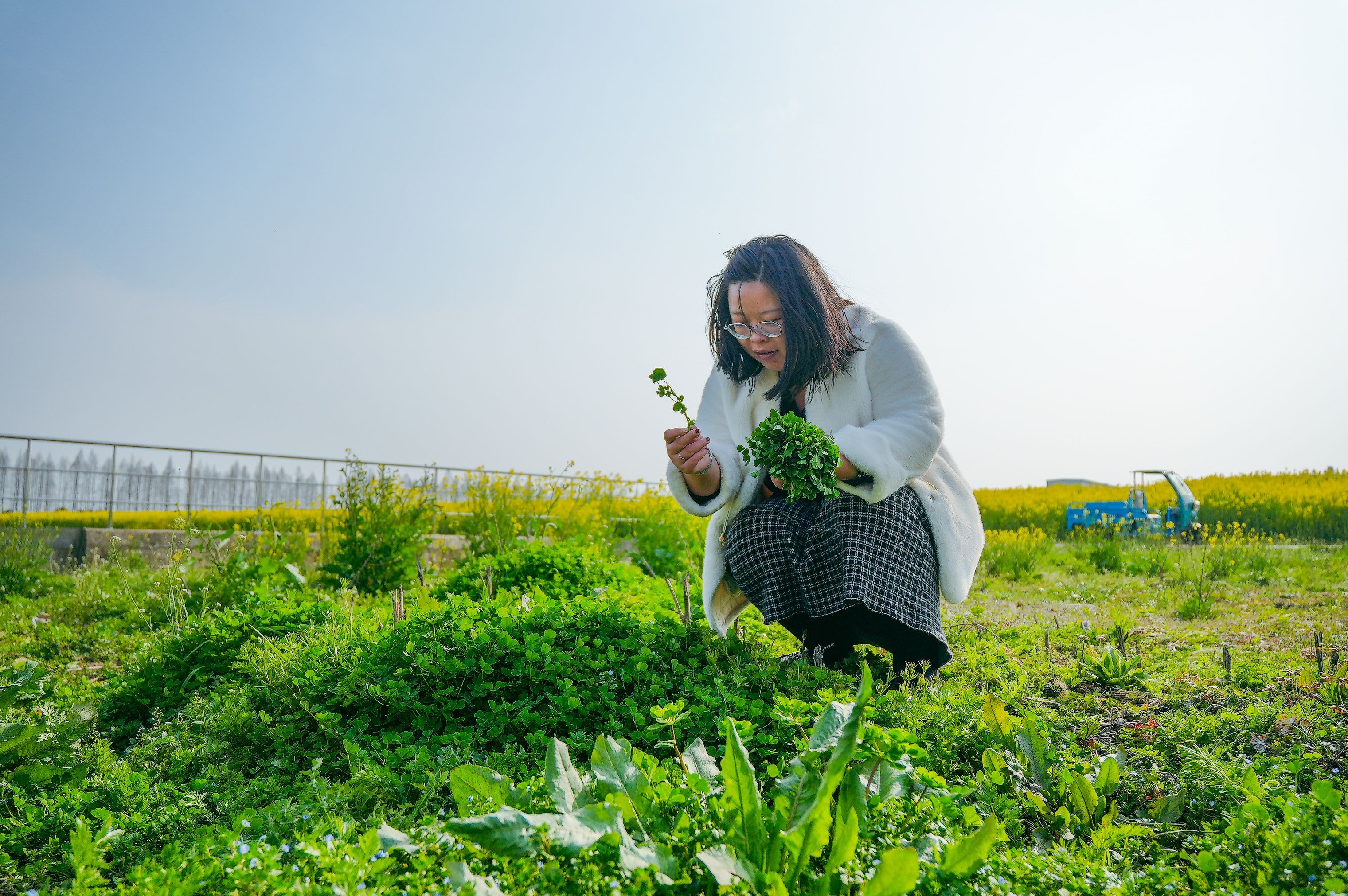家住莲港社区的肖丹正和她的闺蜜们穿梭于花田,一边欣赏美景打卡拍照。“今天来拍油菜花,顺便再多摘点儿苜蓿菜,我儿子很爱吃!”肖丹蹲在田埂旁,脸上洋溢着收获的喜悦。闺蜜黄丽则在不远处发现了新“宝藏”,摘了一把肥硕的野腊菜。短短一刻钟,大家收获满满,随后尽情摆造型,记录美好的春日时光。