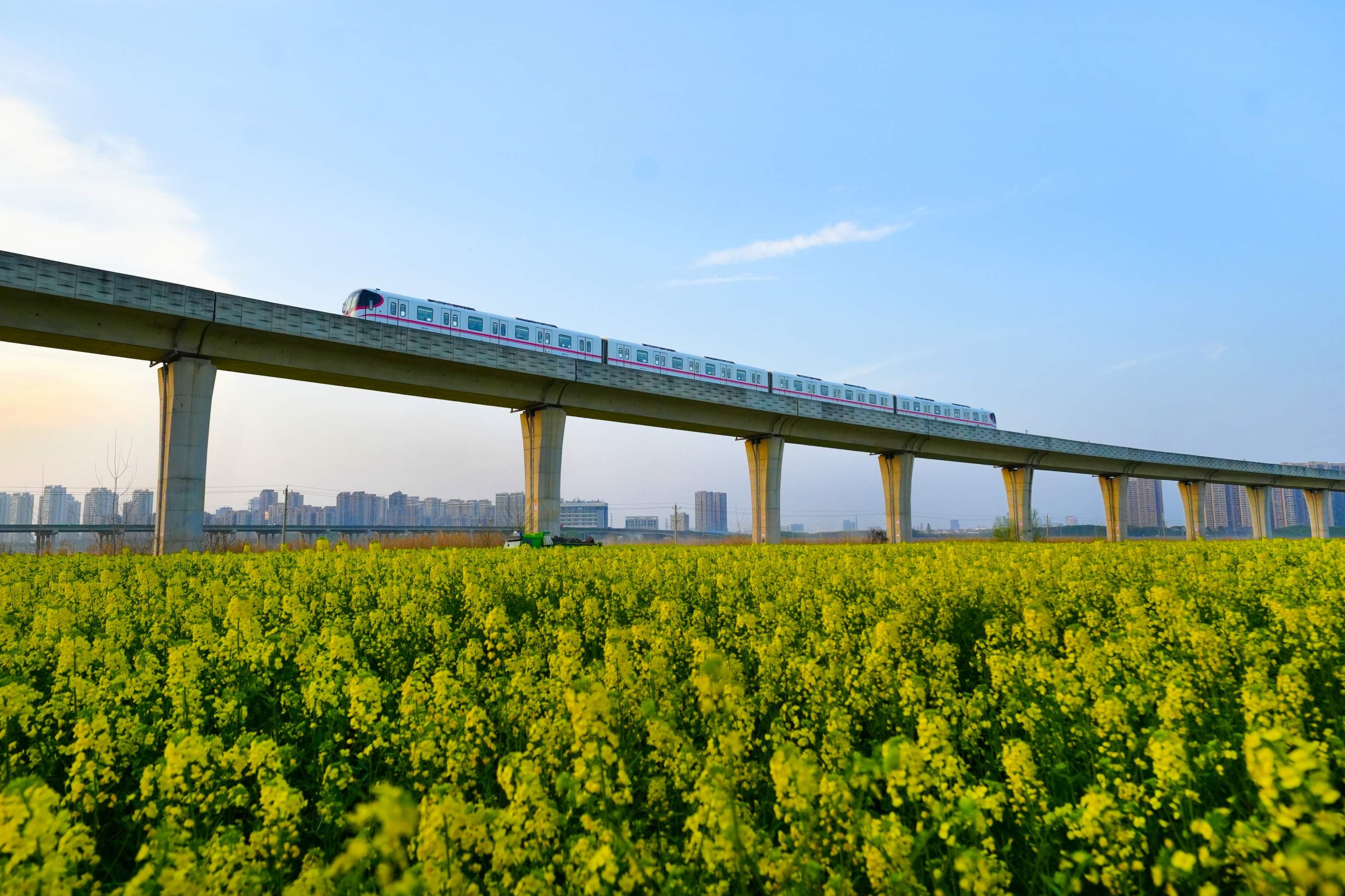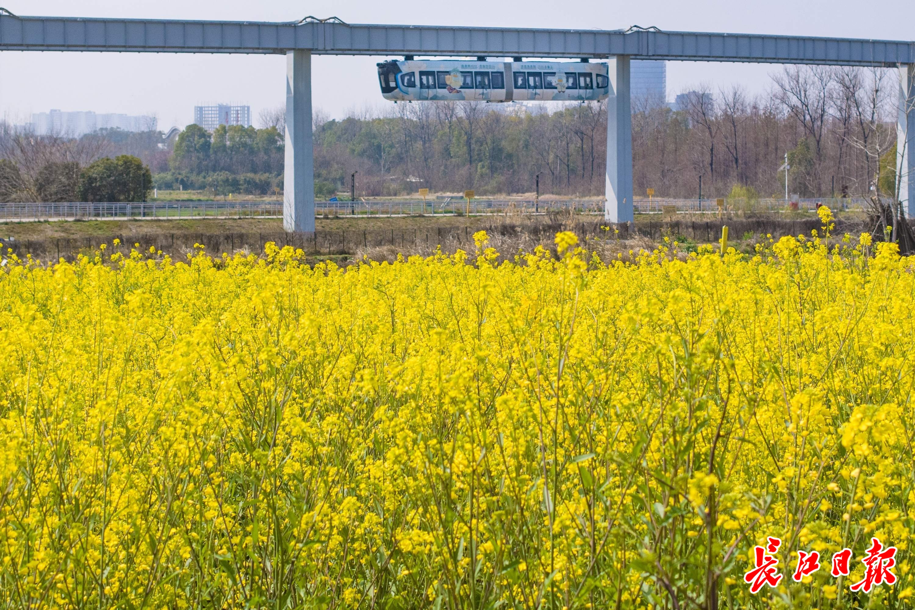 光谷中央生态大走廊综合保税区附近,一大片油菜花进入盛花期。金黄花海,耀眼夺目,春意盎然。市民游客搭乘空轨,即可尽览金色花海及沿线风光,感受城市生态美景。 记者胡冬冬 摄